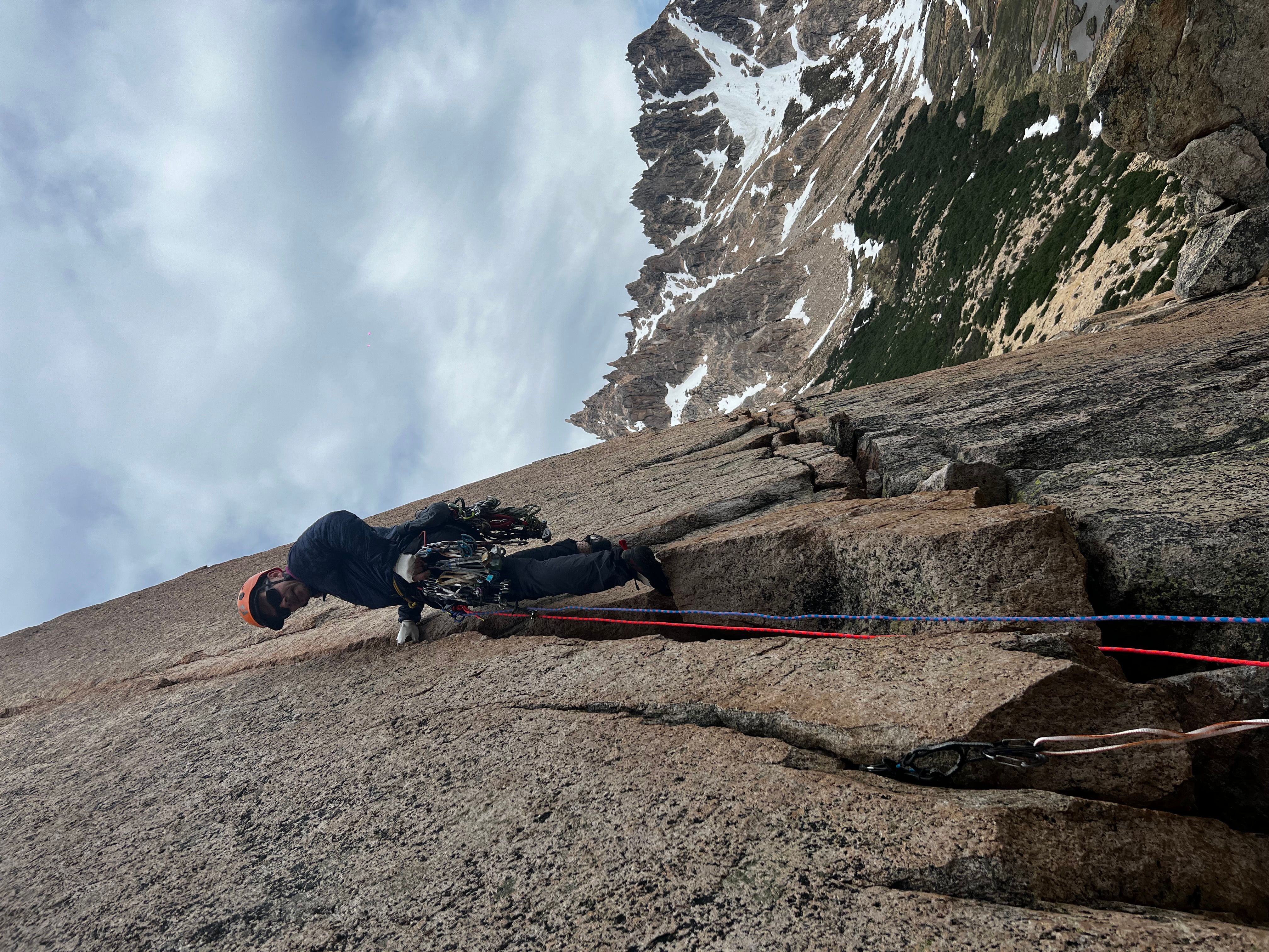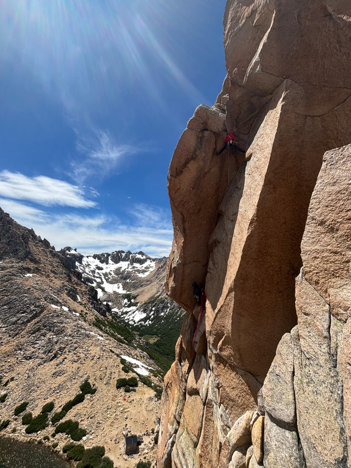I dag skal det stĂžtes! Sondre fikk bruke hele dagen i gĂ„r pĂ„ Ă„ titte opp pĂ„ Aguja Frey og sĂ„ mye pĂ„ linja som fikk rett opp, Sifuentes-Monti ruta. Viten om nye matlager har gitt oss stĂžteenergi, og vi simul-klatrer opp til standplassen under cruxtaulengden. PĂ„ stand mĂžter jeg noen lokale som forklarer meg at den er “Bastante dura por seis b” - veldig hardt for 6b. Jeg vil ikke Ăždelegge psyken til Sondre, sĂ„ jeg lar ham gĂ„ pĂ„. Han leder i god stil opp til bolten ved cruxet, og gir det et skikkelig stĂžt, fĂžr han faller av. Etter et kvarters jobbing spĂžr han om jeg vil overta. Jeg var litt skeptisk, men guidebokas lovnad om lettere terreng etter cruxet overbeviser meg. Etter to fall pĂ„ bolten gĂ„r det endelig - men det lettere terrenget etterpĂ„ er en underdrivelse. Jeg kjemper meg opp til stand, og nĂ„r vi endelig nĂ„r toppen er vi enige om at vi venter med mer klatring til imorgen, nĂ„r vi skal pĂ„ den store juleturen.