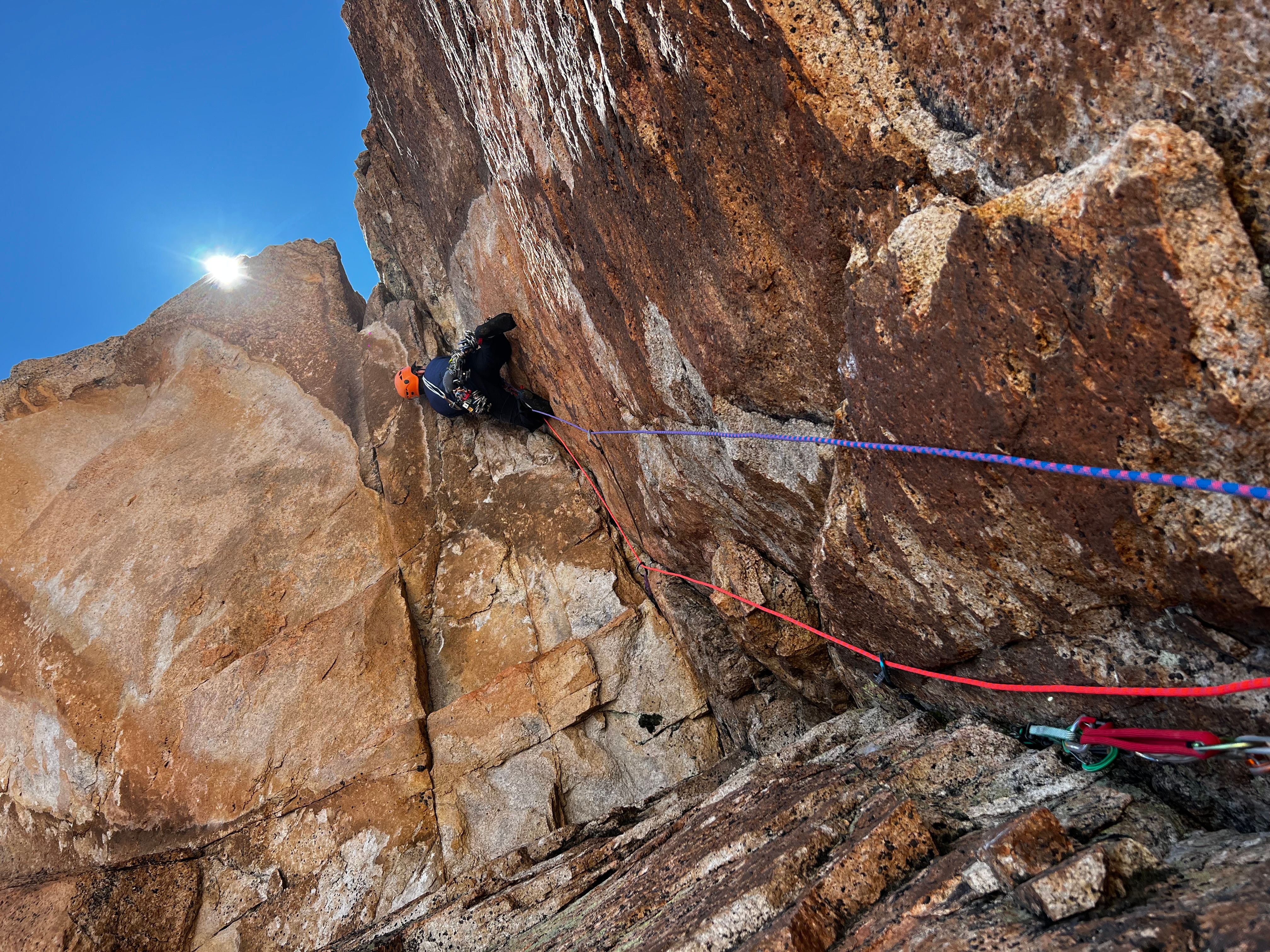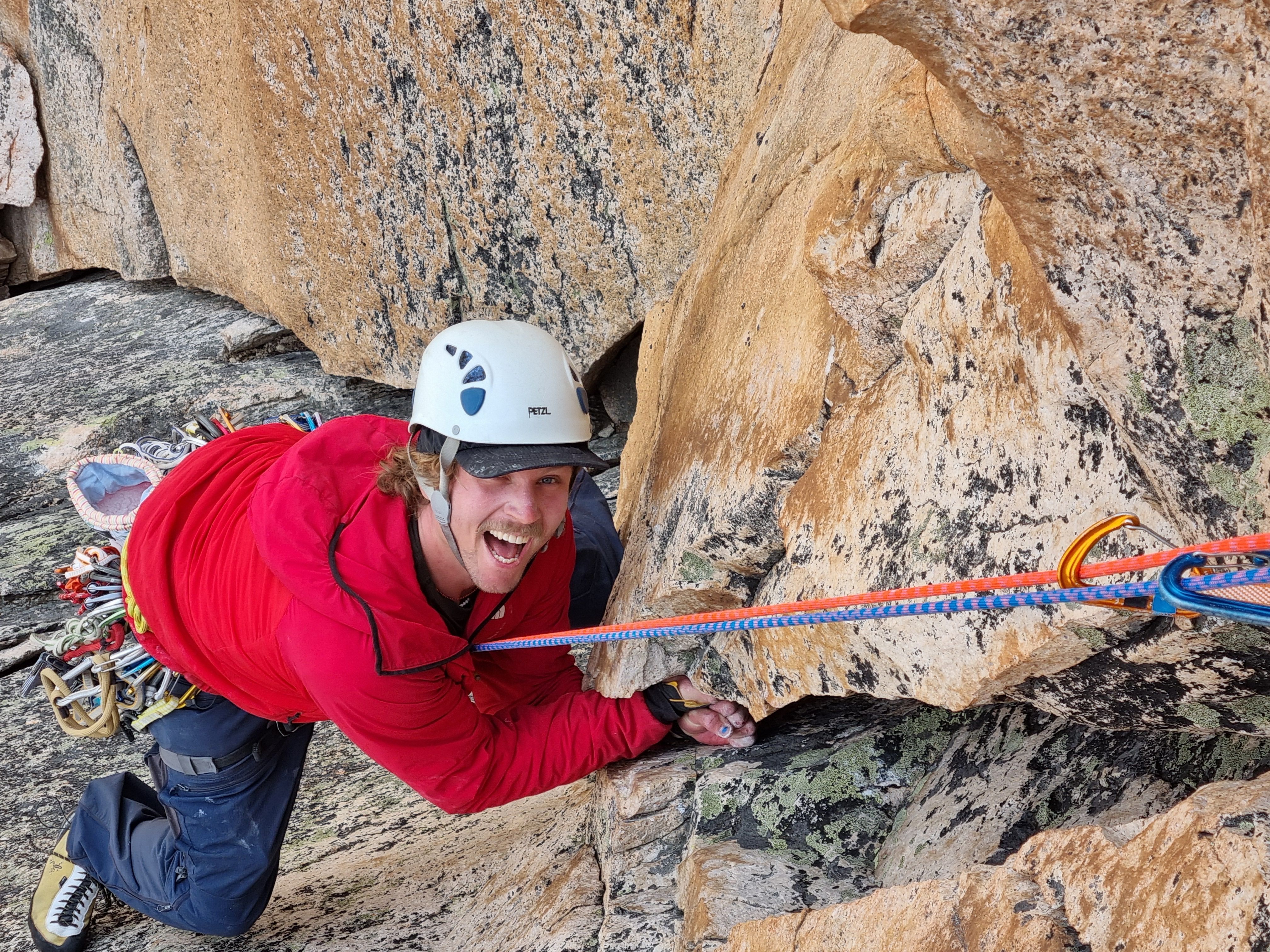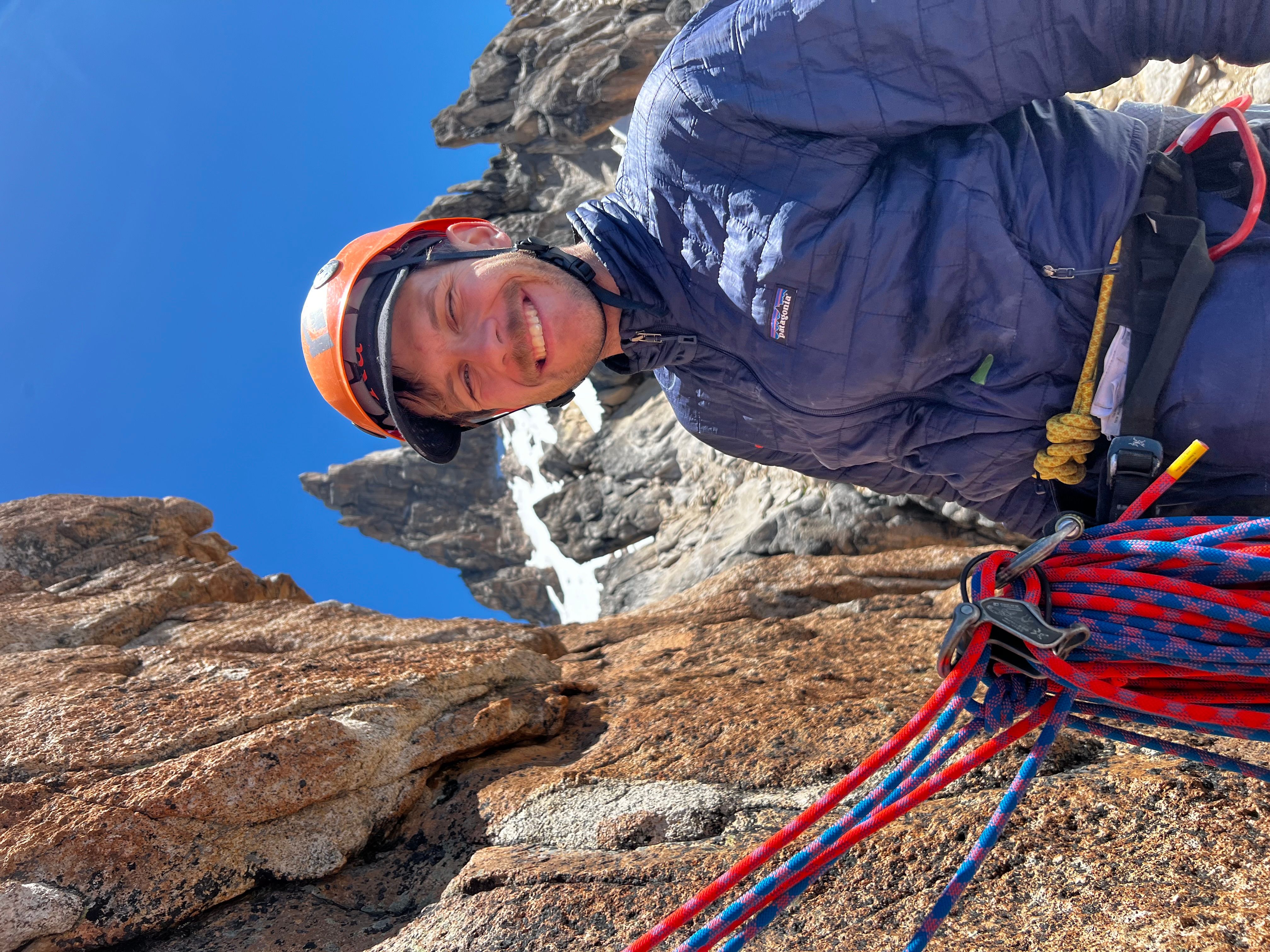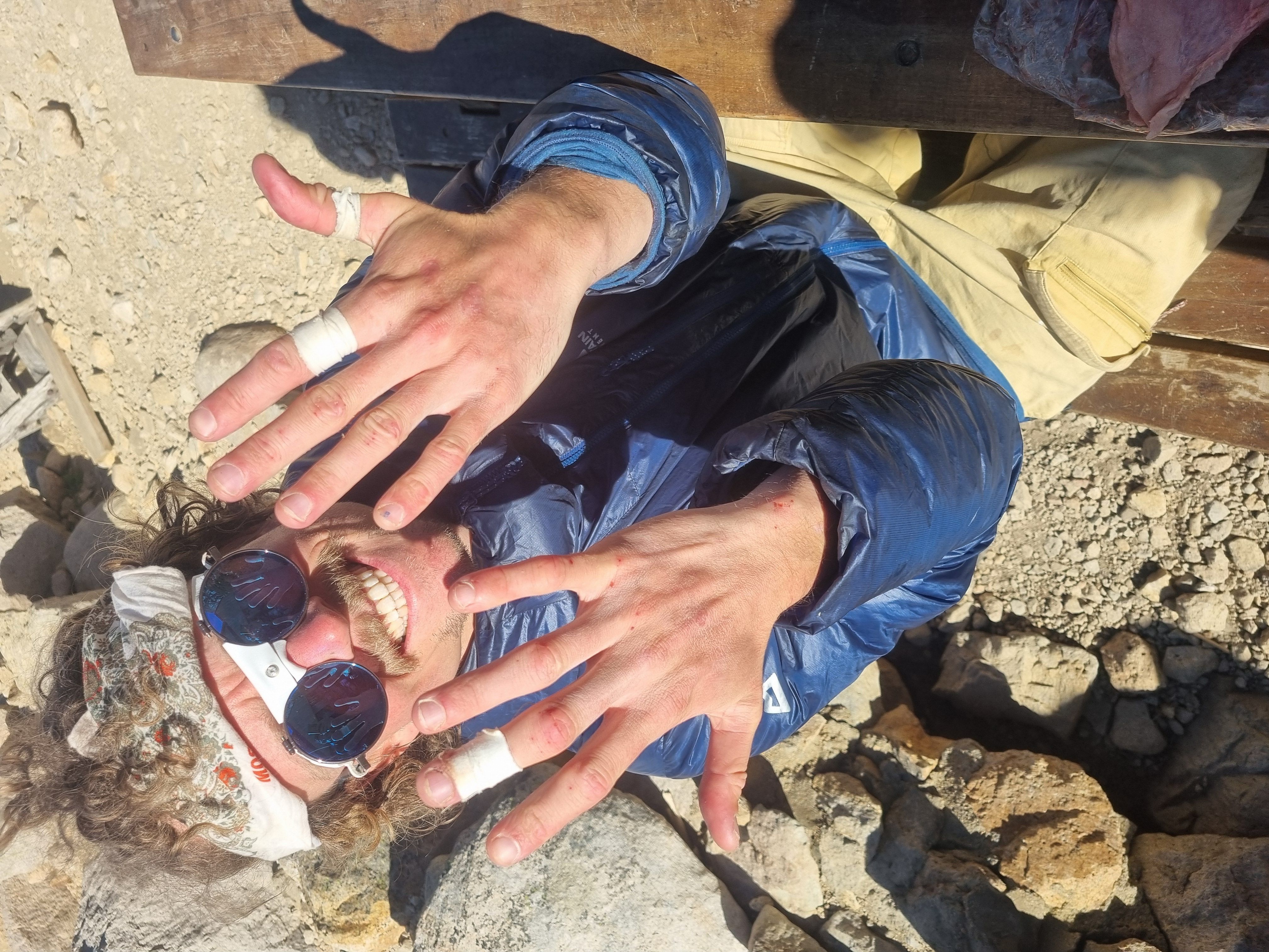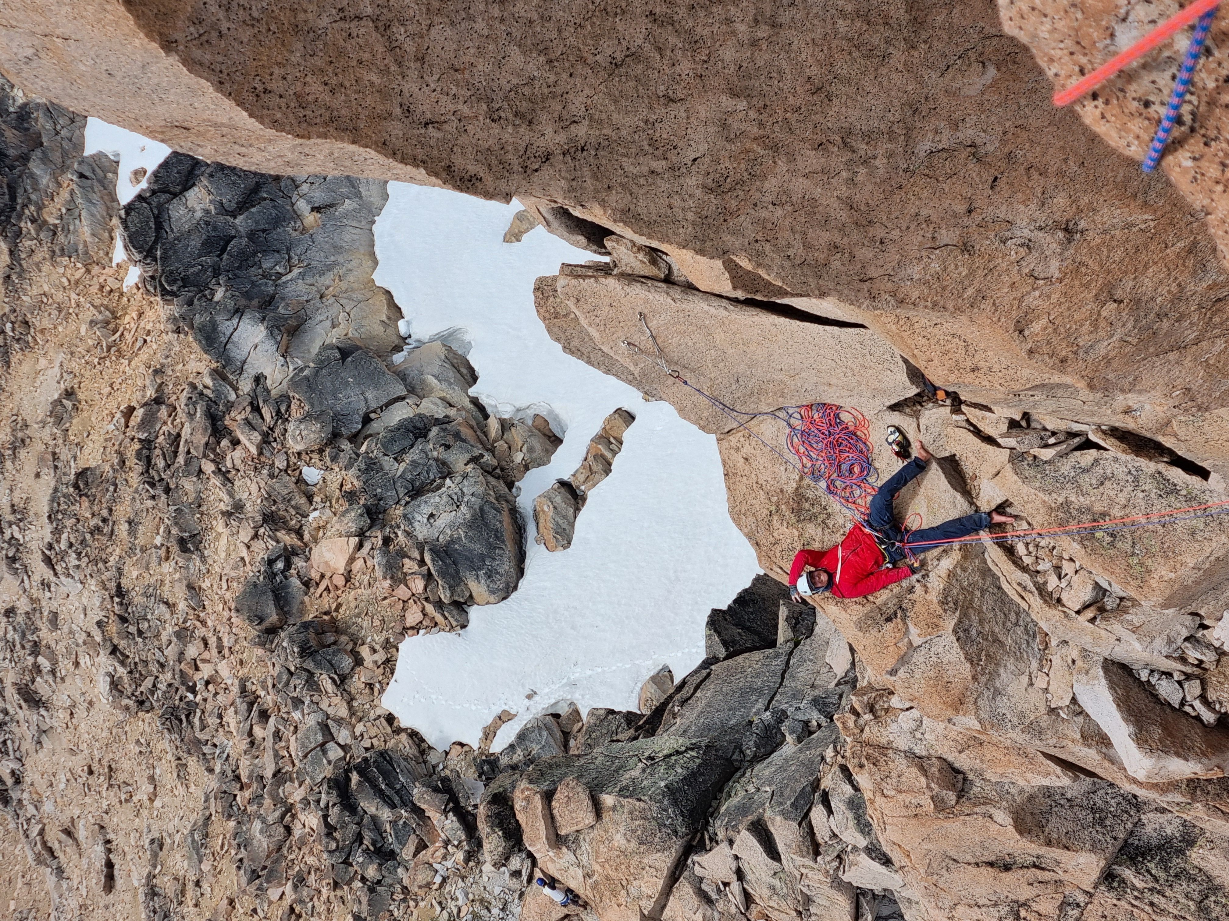 Det er nÄ tre dager siden Sondre fikk halvdelen av tommelen revet av. Idag vil han tilbake og fÄ revansj pÄ toppen, med tommelen i bandasje. For sikkerhets skyld starter vi fra camp allerede kl 07, for Ä ha god tid. NÄr vi stÄr ved innsteget starter Sondre med Ä lede de fÞrste taulengdene, med tommelen i bandasje! Vi nÄr toppen som dagens fÞrste, og rekker Ä fjase rundt en stund fÞr vi rappellerer ned.