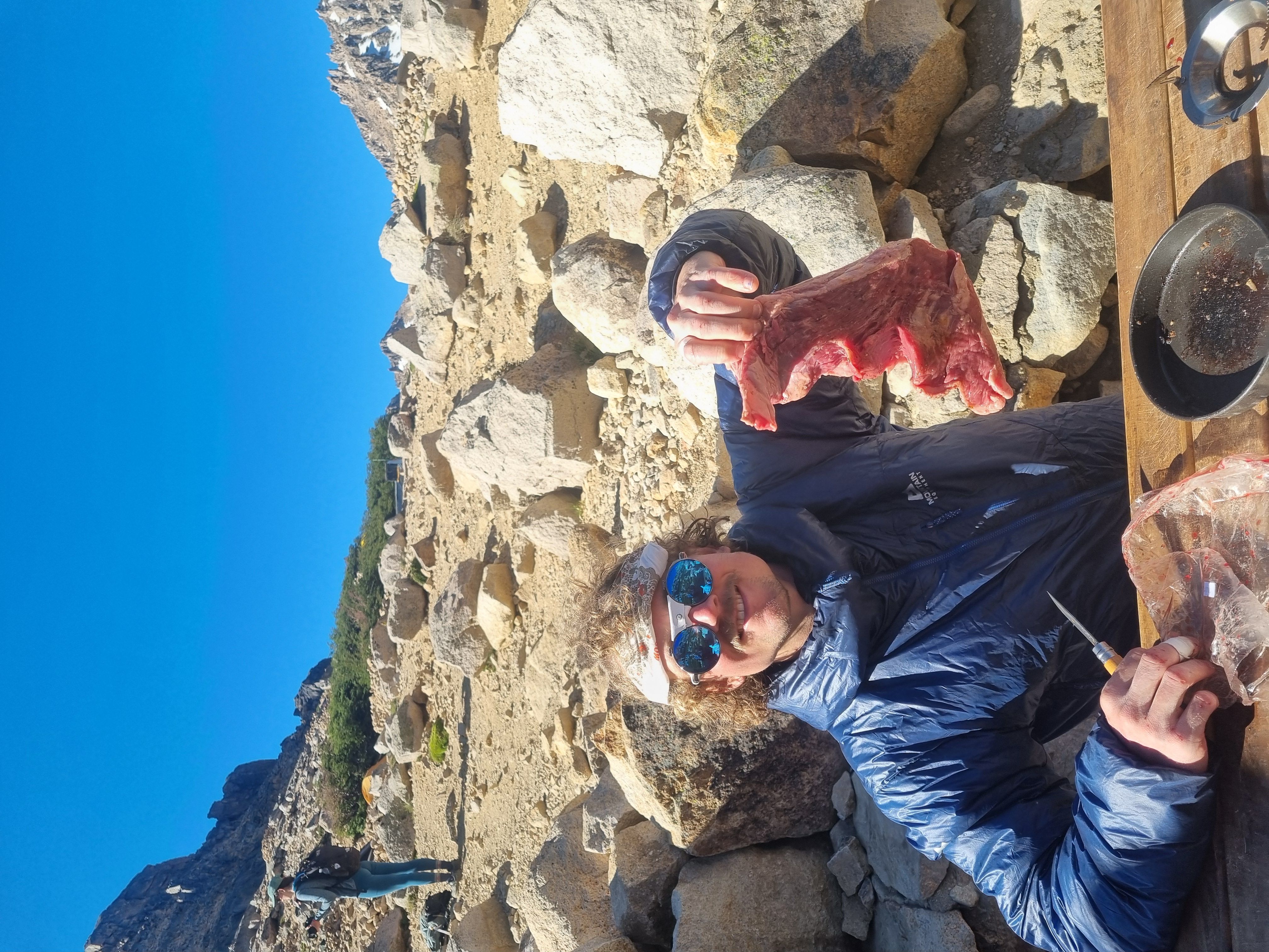 Teltet fĂ„r morgensol, sĂ„ vi vĂ„kner ganske tidlig. Vi har allerede kommet inn i rutinen med kaffe, frokost, og klargjĂžring for dagens mĂ„l. Under frokosten er vi litt bekymret for matmengden og om vi har fĂ„tt med oss nok til hele oppholdet. Sola steker pĂ„ teltet om dagen, sĂ„ vi har bygd et “kjĂžleskap” av stein utenfor teltet, for Ă„ oppbevare melk, ost, kjĂžtt, og sjokolade. For Ă„ rasjonere kjĂžttmengden har vi tatt med noen kilo linser, sĂ„ vi hĂ„per vi klarer oss pĂ„ det. Vi legger linsene i blĂžt og kommer oss avgĂ„rde fĂžr det blir alt for varmt.