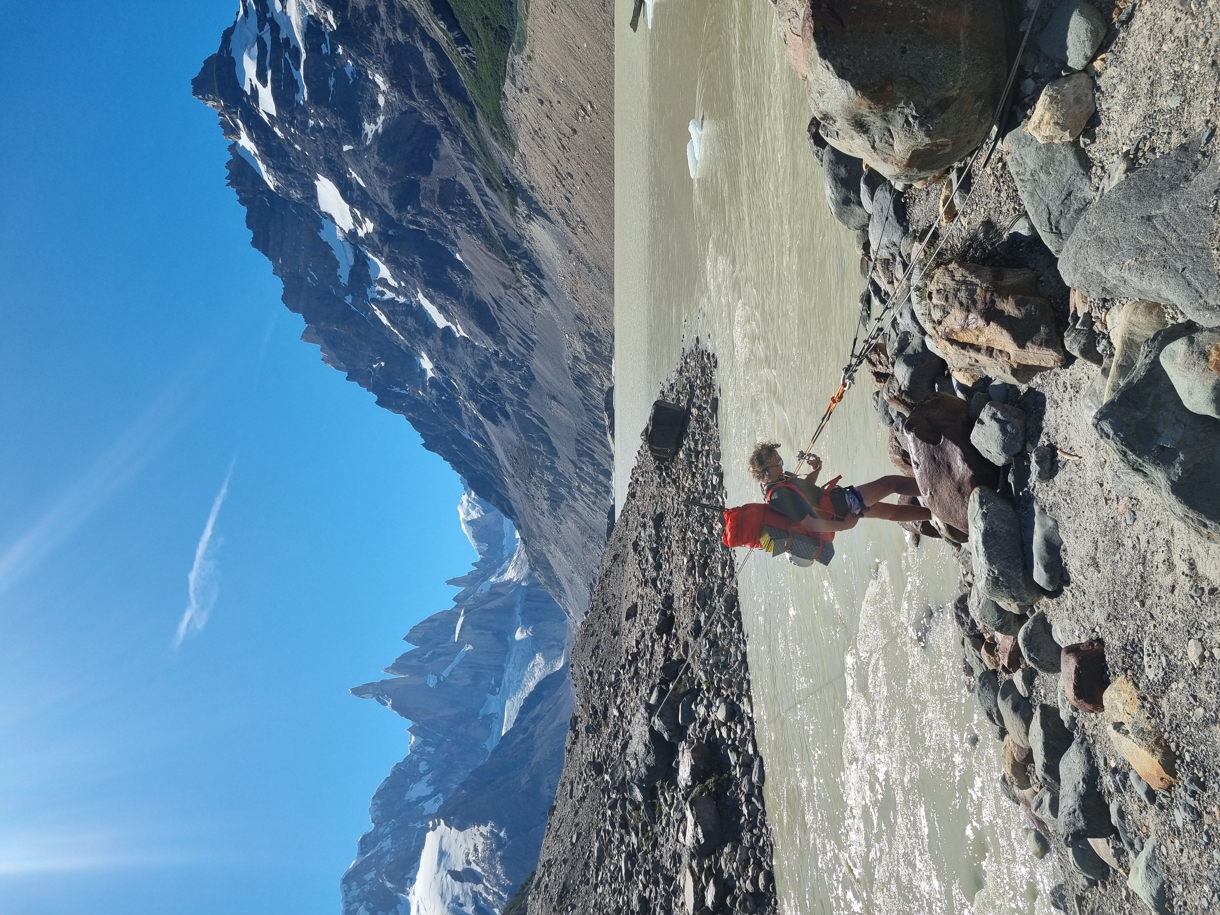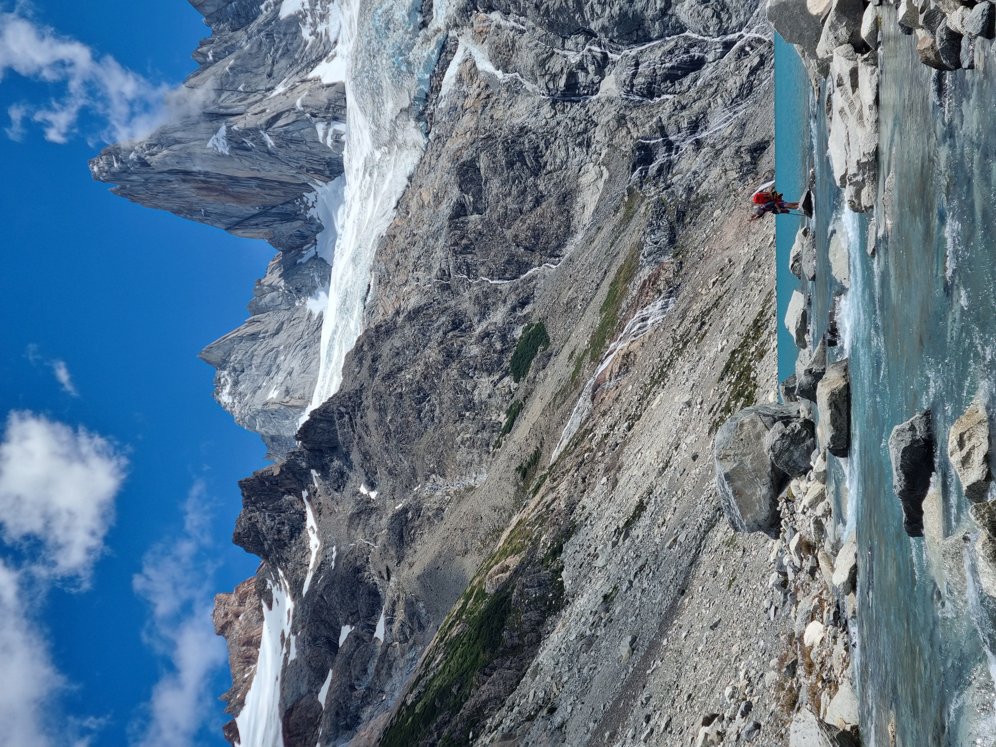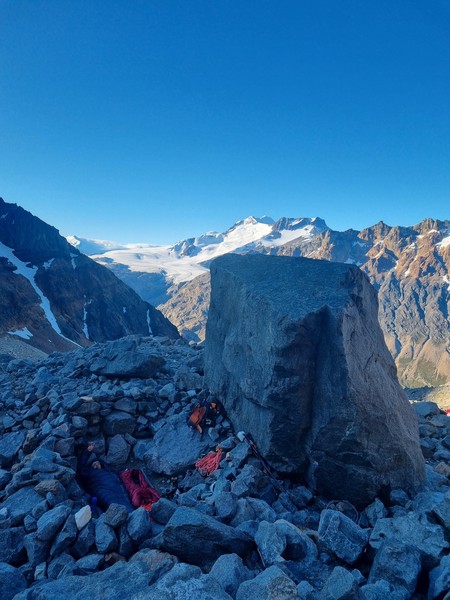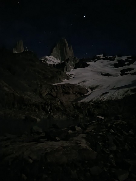Vi skyndte oss videre, til vi endelig nĂ„dde punktet der anmarsjen forlot turstien. Her tok vi en rask pause og nĂžt stillheten i fjella. Vi trasket videre opp langs RĂo Blanco til vi kom til vadestedet ved Lago Sucia, helt klart den mest ikoniske elvekrysningen jeg har vĂŠrt med pĂ„ sĂ„ langt. Det var fremdeles tidlig da vi nĂ„dde opp til bivyen, sĂ„ vi utnyttet muligheten til Ă„ rekognosere morgendagens anmarsj, etter hvilket Sondre unnet seg en lur, mens jeg Ăžvde pĂ„ munnspillet jeg hadde fĂ„tt lĂ„ne i nede Chalten. Noen timer senere kom det flere til - vĂ„re australske venner, og et knippe brasilianere som ogsĂ„ ville prĂžve seg pĂ„ den samme ruta. Vi spiste nyttĂ„rsmiddag, drakk rĂždvin, og la oss tidlig med alarmen satt til kl 3.