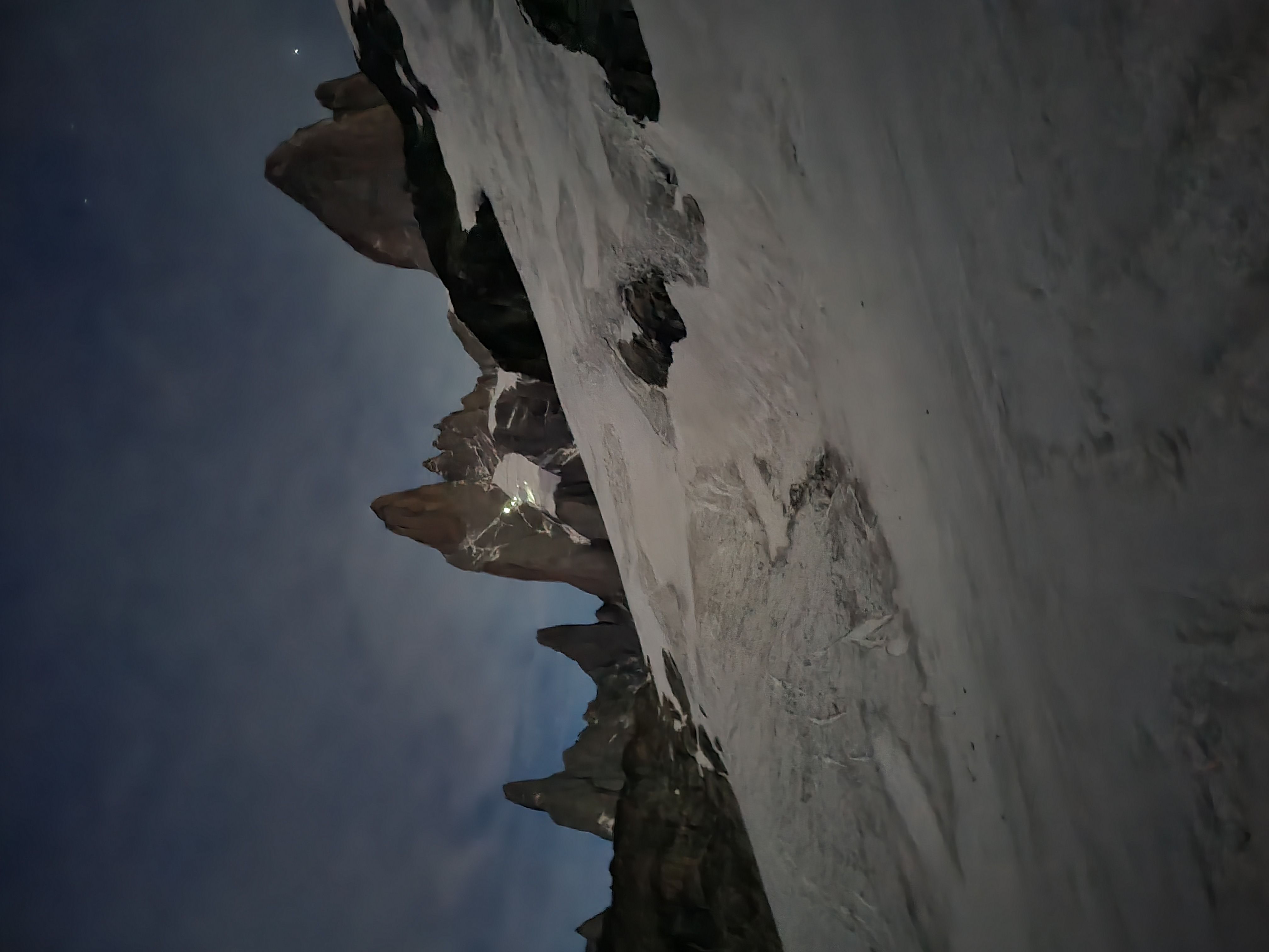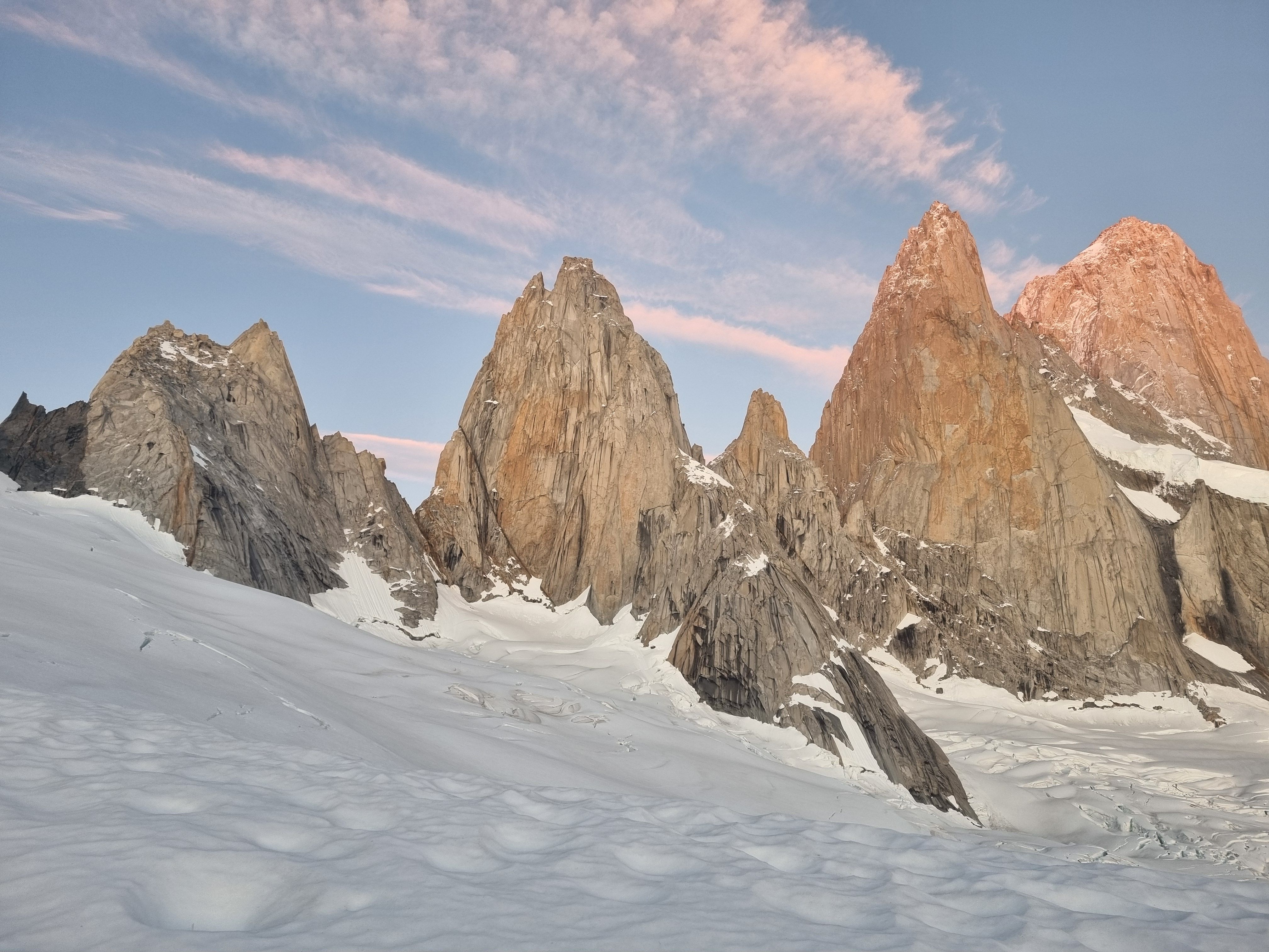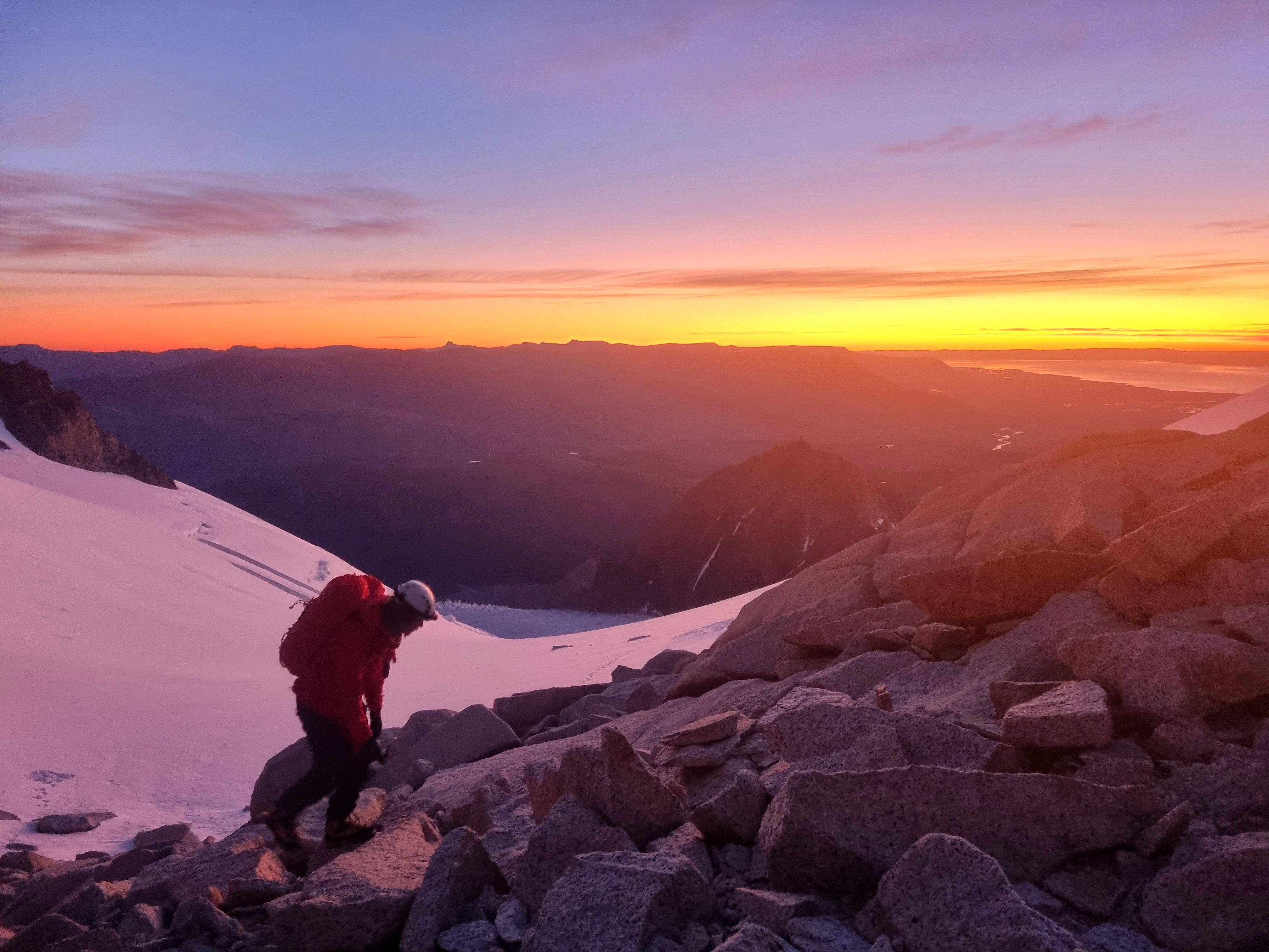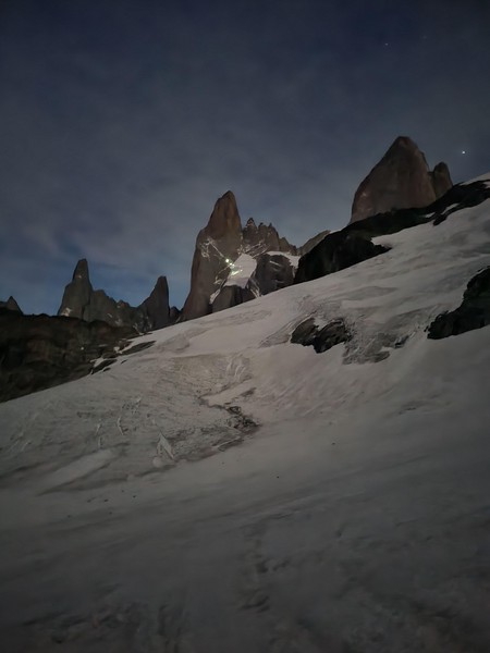 NÄr alamen gÄr er det vanskelig Ä tro at jeg ikke drÞmmer, med melkeveien som strekker seg i alle himmelretninger over meg. En rask morgenkaffe og sjokolade senere starter vi anmarsjen som taulag #4, allerede kl 0350. Vi fÞlger de andre lyspunktene oppover - det er kaldt, sÄ jeg har for en gangs skyld en varm start. Vi nÄr ryggen etter halvannen time som det 2. taulaget, men dette hellet blir overskygget av en sÊrdeles spektakulÊr soloppgang over Lago Viedma, som lyser opp Cerro Chalten-massivet. Tause av beundring blir vi stÄende og nyte dette synet mens vi venter pÄ vÄr tur ved innsteget.