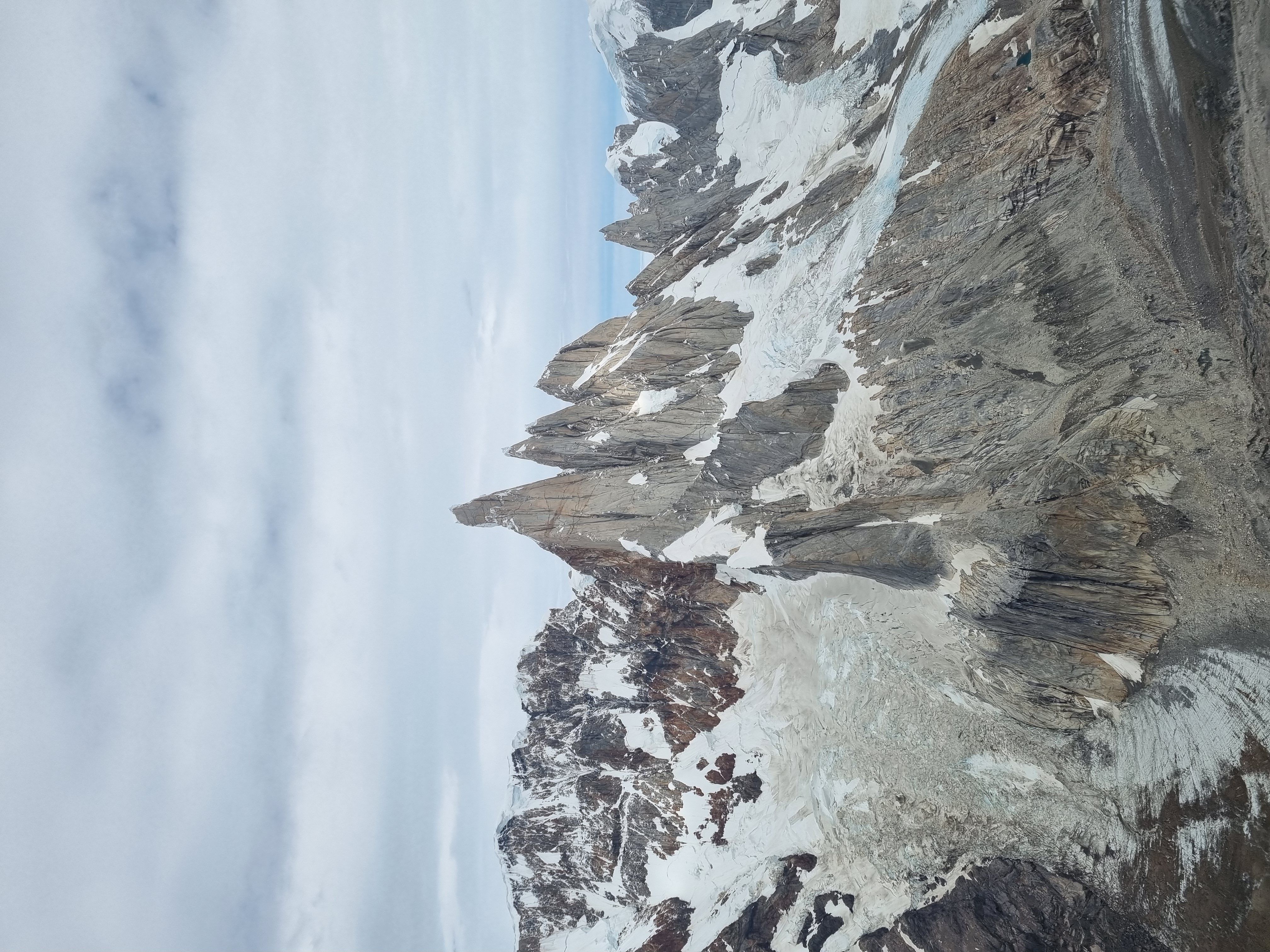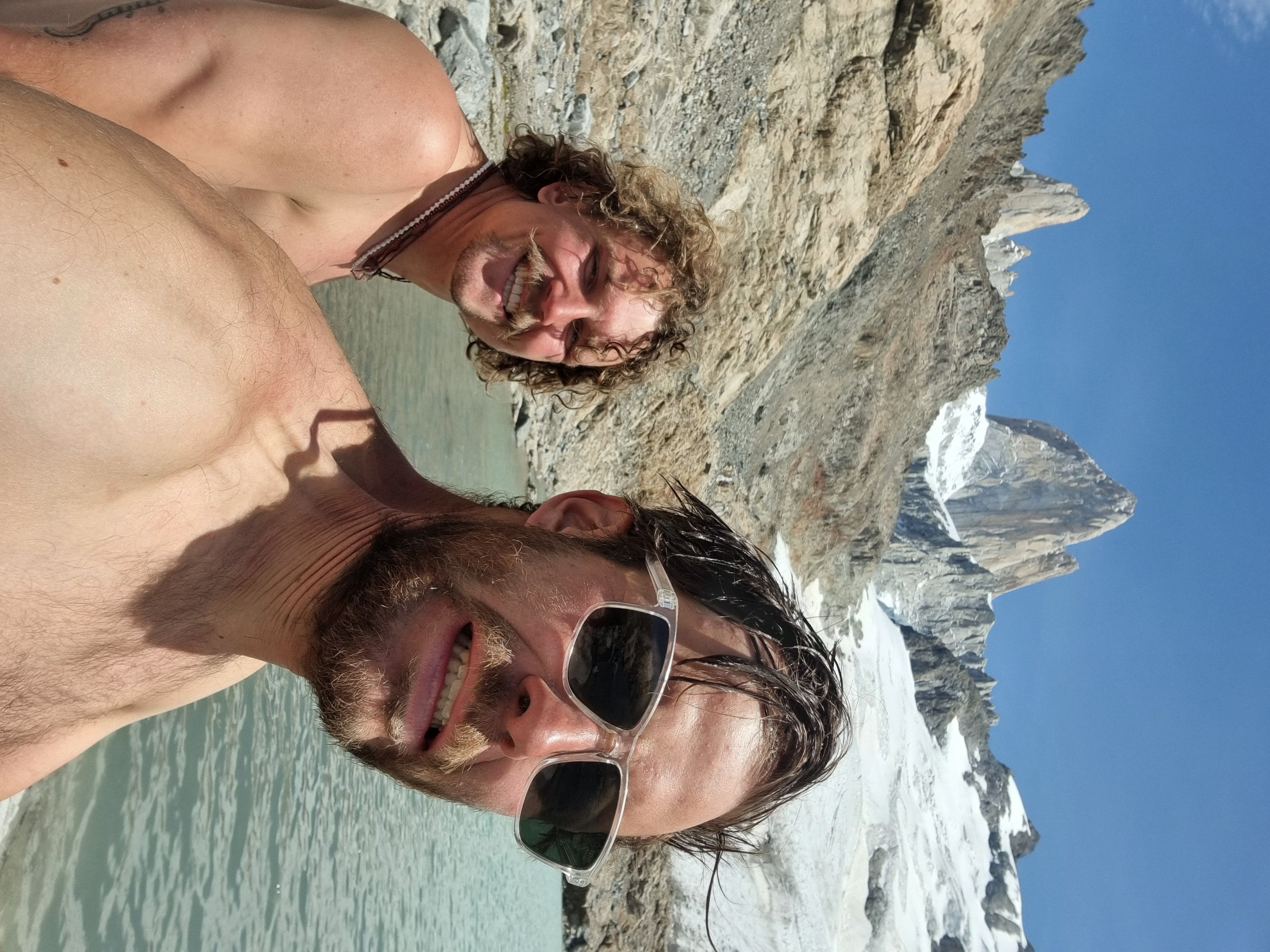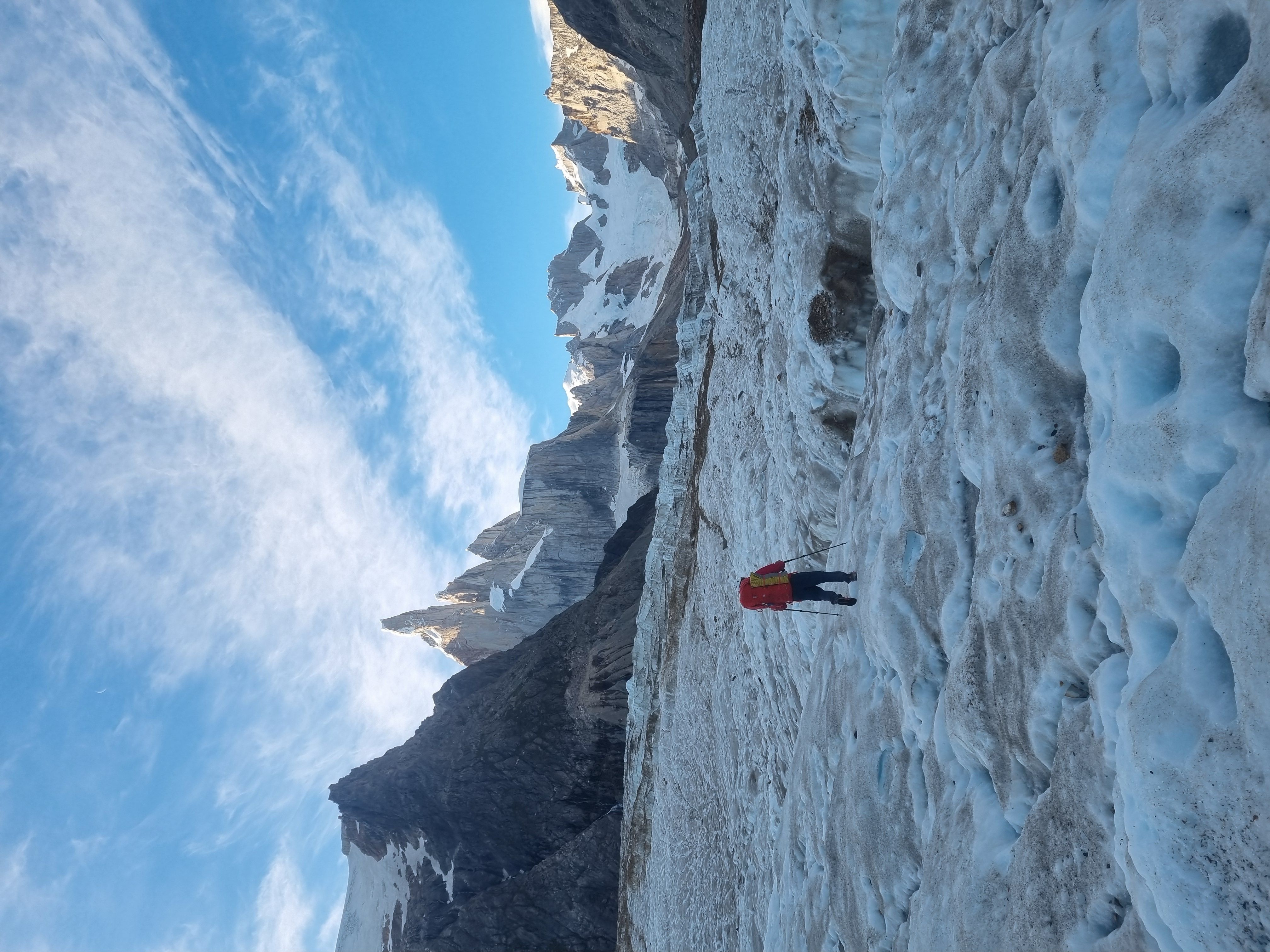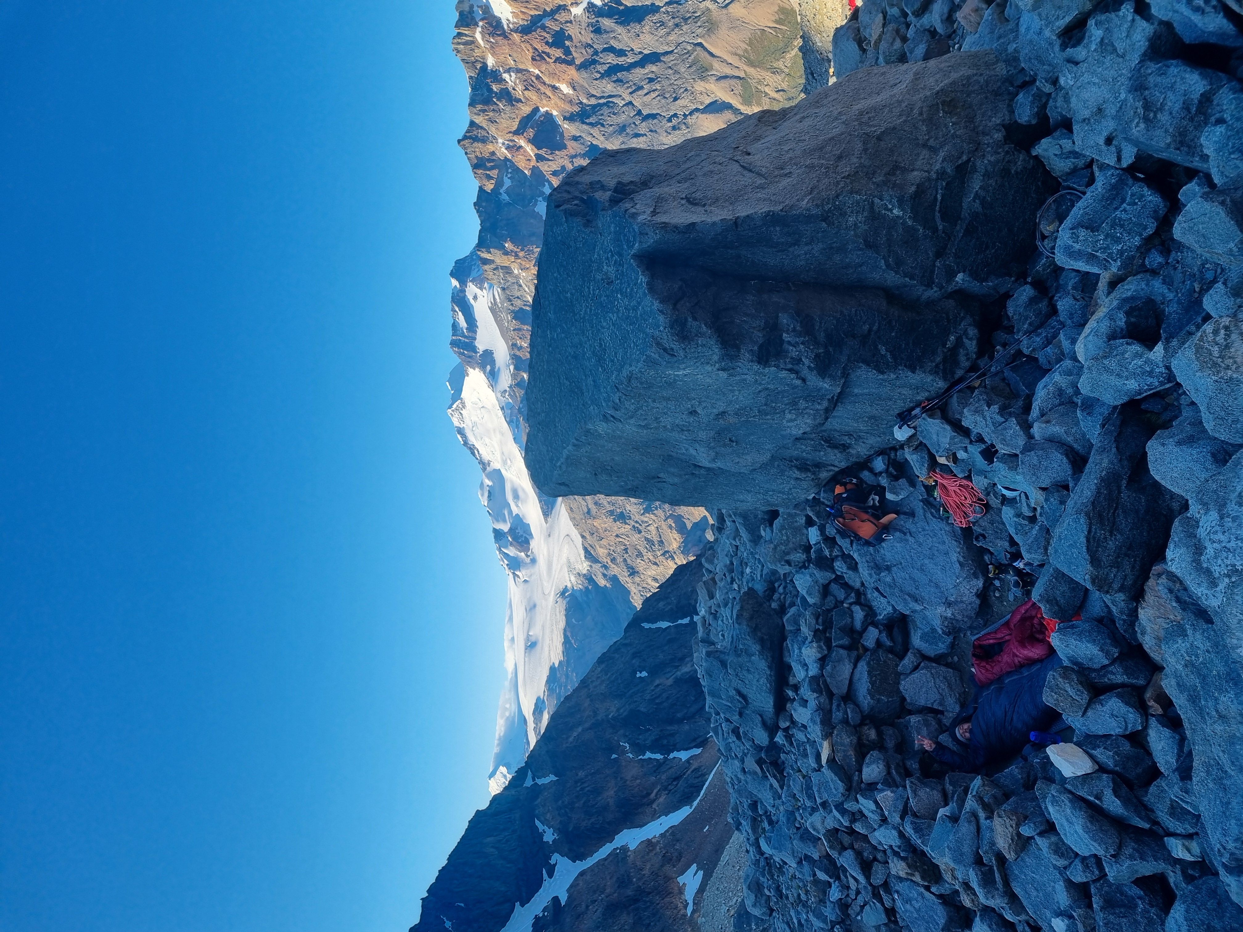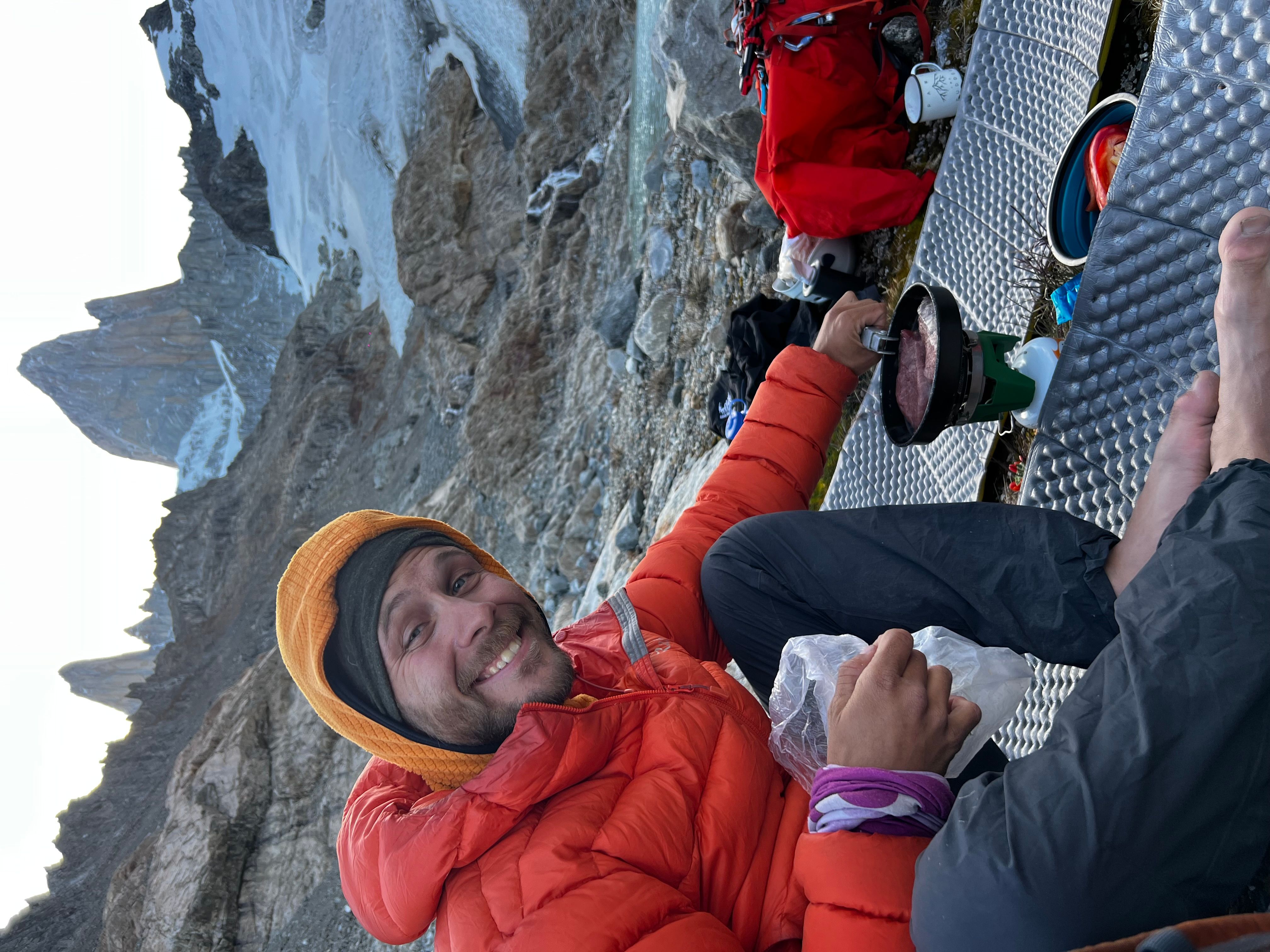 PÄ vei ned mÞter vi australerne, som har snudd ved snÞfeltet, og slÄr fÞlge tilbake over breen. Idet vi stÄr pÄ brekanten kommer det et stort steinsprang, og vi mÄ hoppe unna for Ä unngÄ Ä bli truffet. Lettere rystet kommer vi trygt ned pÄ andre siden av breen og ned i camp. Jeg melder meg frivillig til Ä lÞpe ned i forveien og ordne middag mens Sondre tar det med ro pÄ turen ned. NÄr jeg nÄr ned igjen hÞrer jeg at pÄ fjellet ved siden av oss har det vÊrt 2 redningsaksjoner bare samme dag. GrÞss og gru - vi har kommet opp og ned i sikkerhet, men vi har fÄtt fÞle pÄ risikoen med Ä utforske disse fjellomrÄdene.
