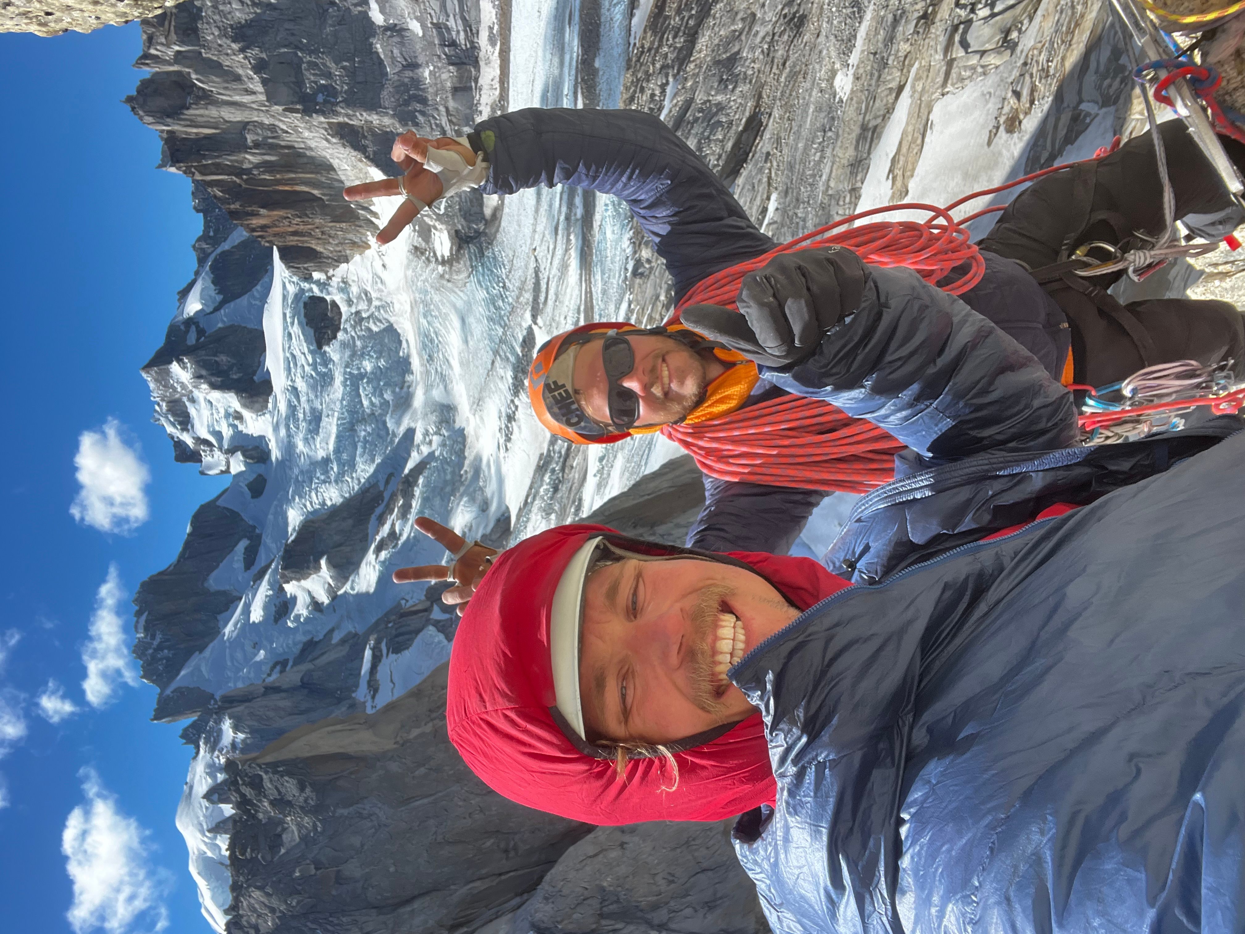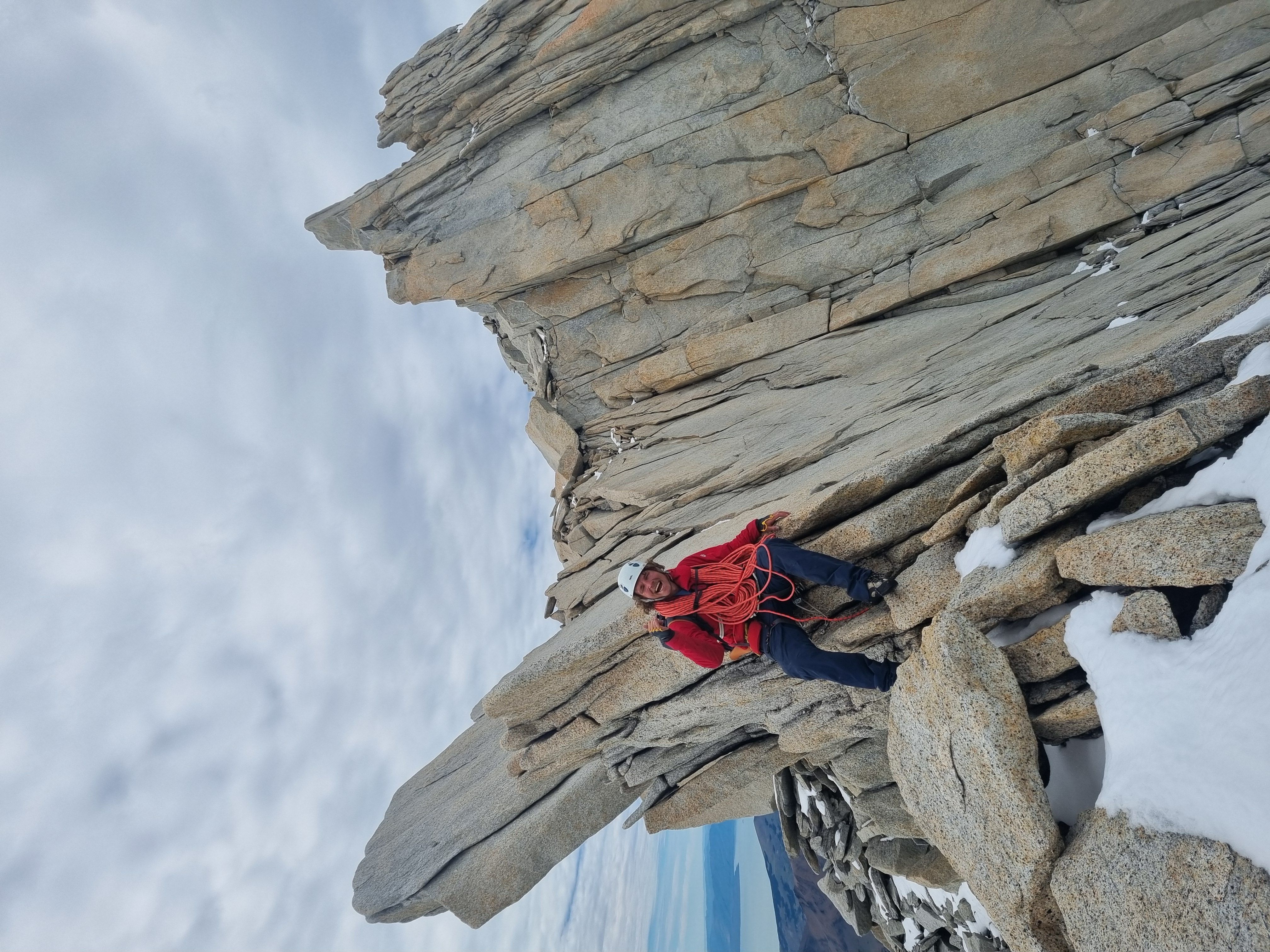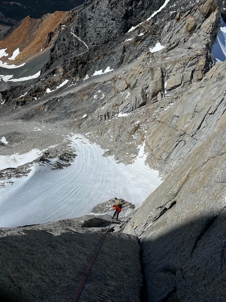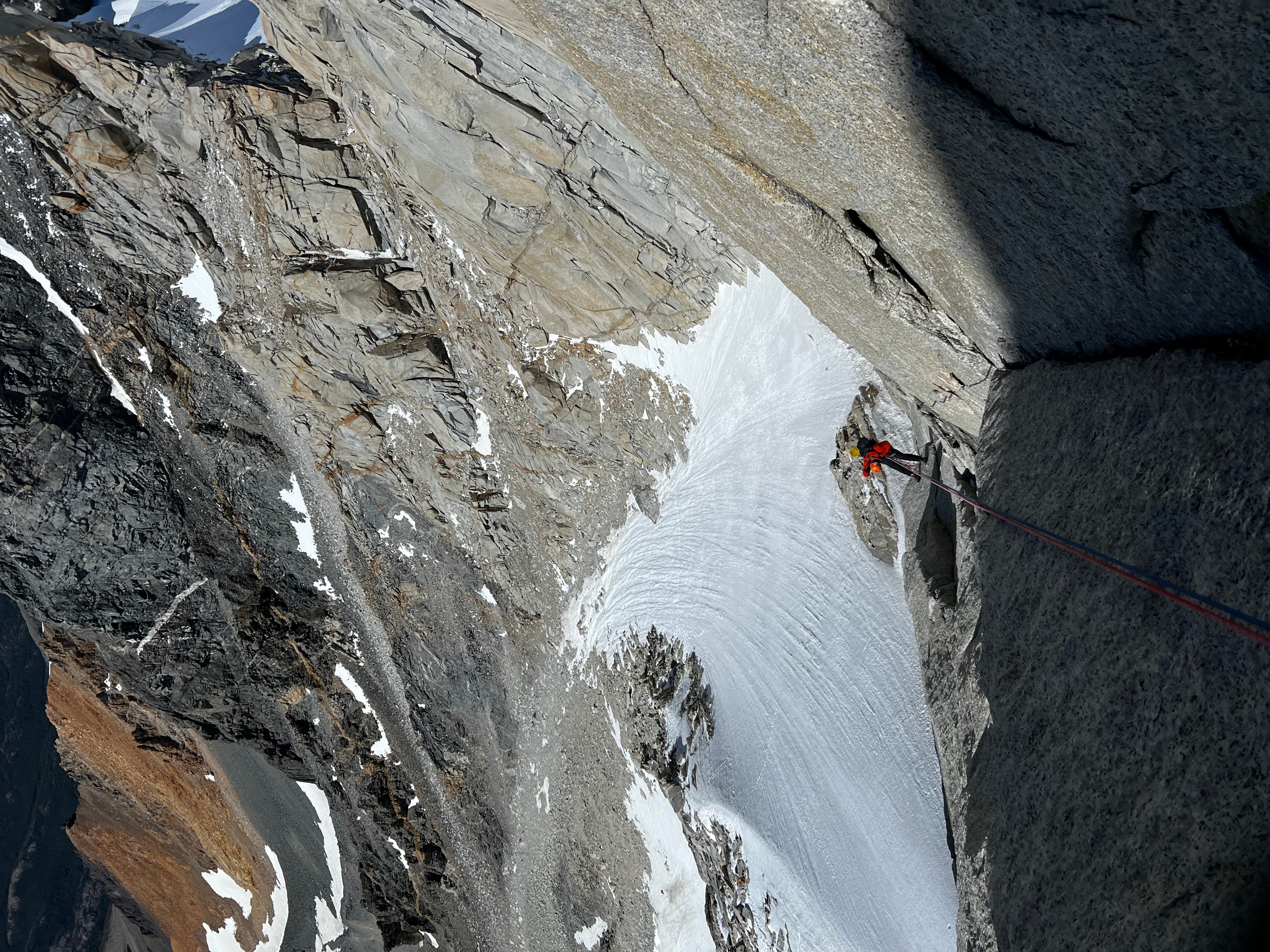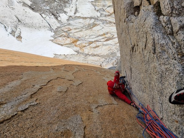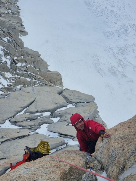 Vi racker opp med alle klÊrne pÄ, og Sondre gÄr i gang med Ä lede de fÞrste 3 t.l. lÞpende - med hansker og isÞks for Ä hakke is ut av sprekkene - og idet vi nÄr cruxtaulengden er fÞlelsen sÄ smÄtt kommet tilbake i fingre og tÊr. Jeg fÄr fÞrste stÞt opp kaminen, og kjemper meg forbi isglatte sprekker og snÞdekt stein, til jeg endelig fÄr pÄ dunisen pÄ stand - i le! Sondre kjÞrer videre opp neste t.l. nesten uavbrutt for Ä holde varmen mens jeg sosialiserer med noen nye standplassnaboer fra Tirol. Deretter fÞlger en luftig fingertravers med utsikt ned til breen under oss - sannsynligvis den kuleste taulengden jeg har ledet sÄ langt pÄ denne turen, ikke minst fordi det hele ble gjort med full alpinsekk pÄ ryggen - heftig!