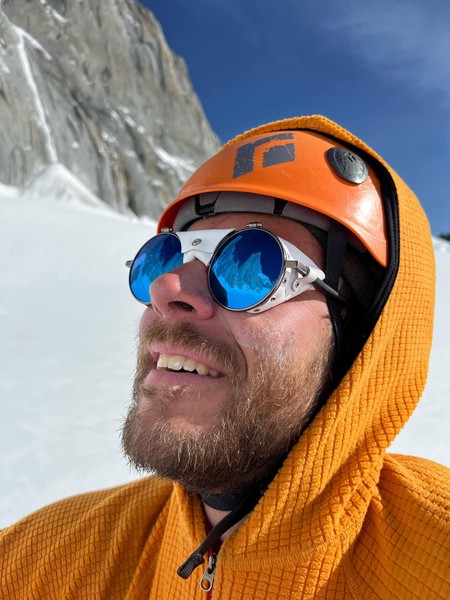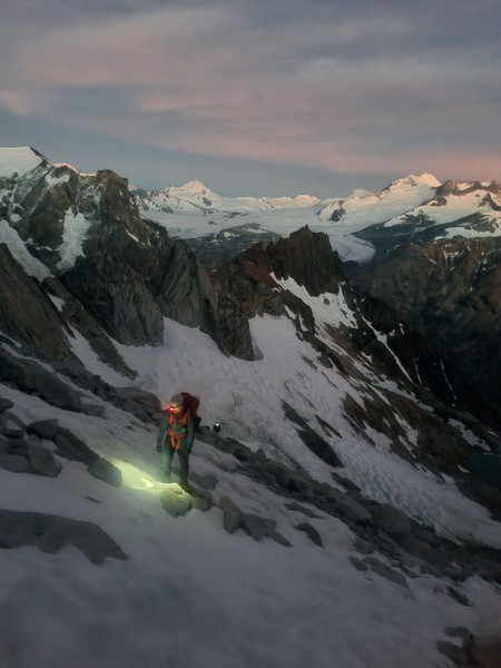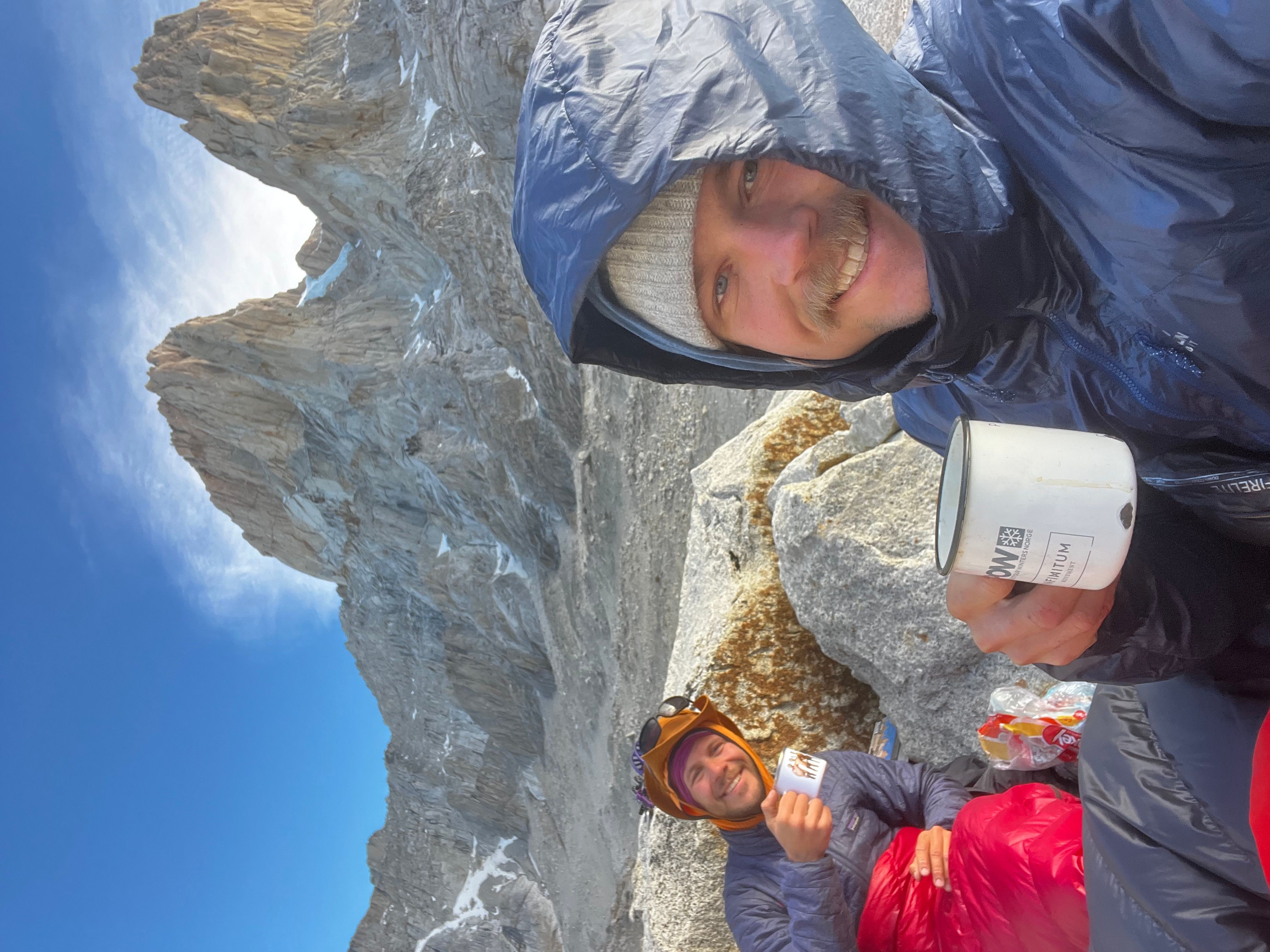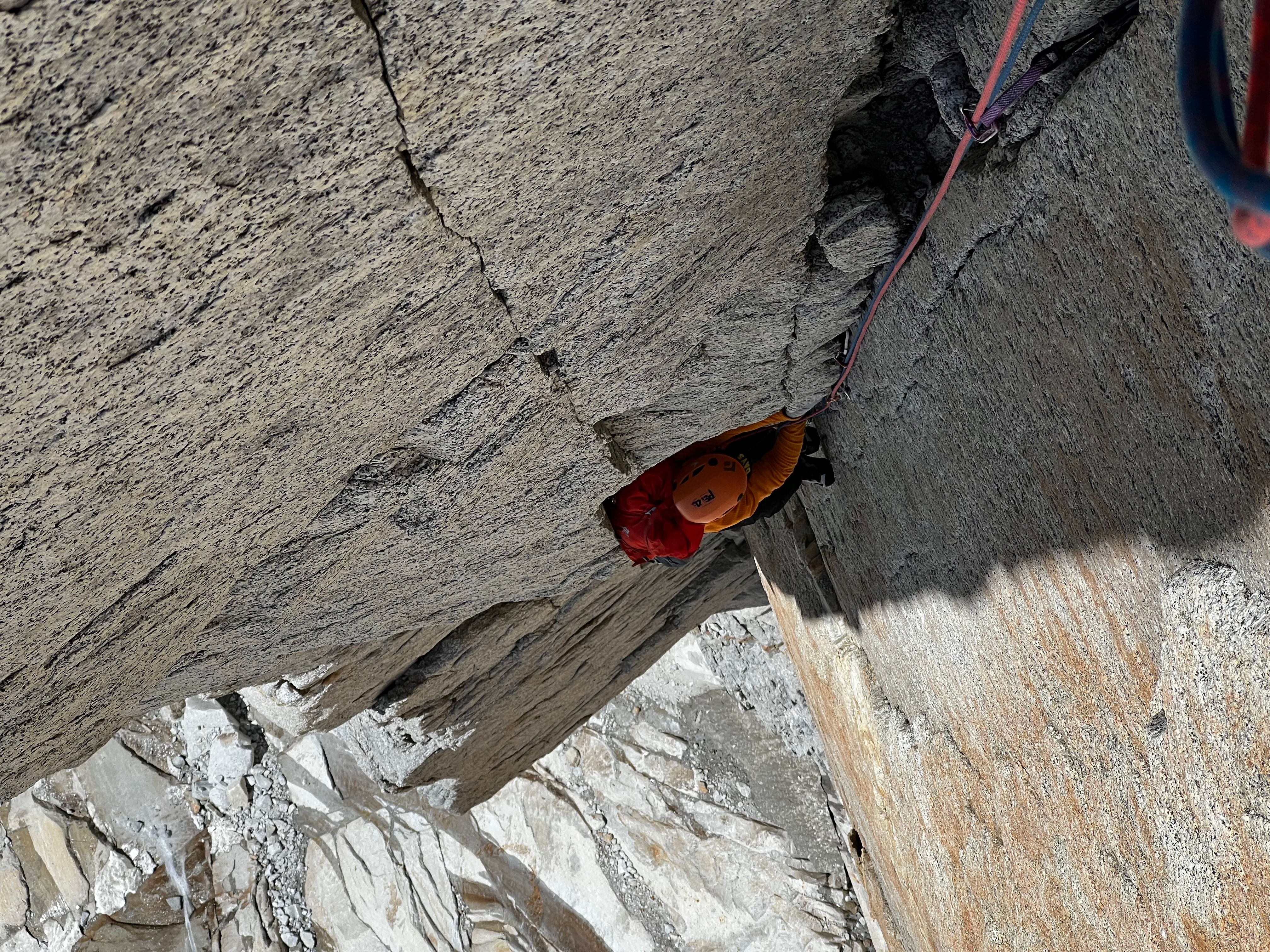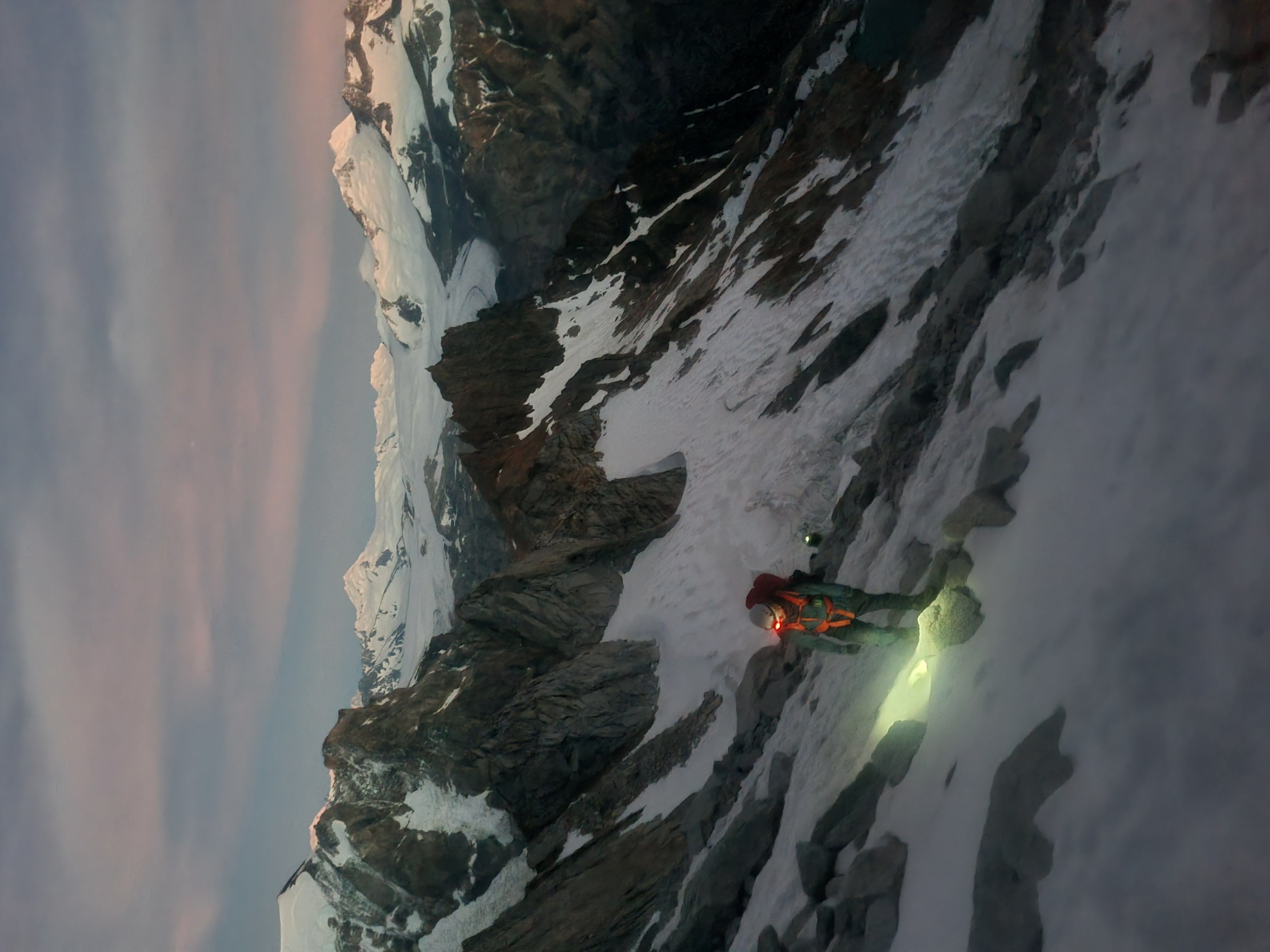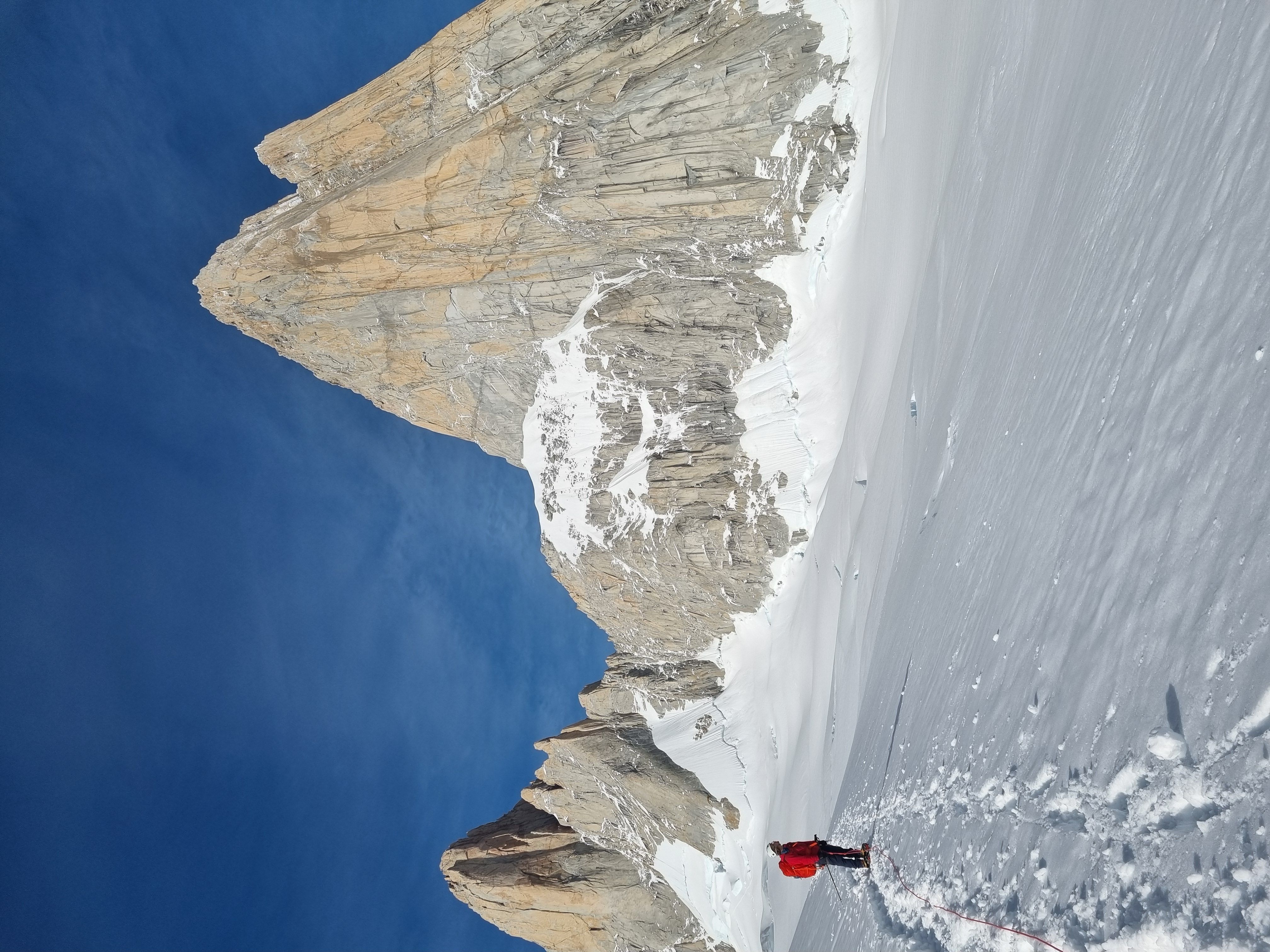 Vi racker opp med alle klÊrne pÄ, og Sondre gÄr i gang med Ä lede de fÞrste 3 t.l. lÞpende - med hansker og isÞks for Ä hakke is ut av sprekkene - og idet vi nÄr cruxtaulengden er fÞlelsen sÄ smÄtt kommet tilbake i fingre og tÊr. Jeg fÄr fÞrste stÞt opp kaminen, og kjemper meg forbi isglatte sprekker og snÞdekt stein, til jeg endelig fÄr pÄ dunisen pÄ stand - i le! Sondre kjÞrer videre opp neste t.l. nesten uavbrutt for Ä holde varmen mens jeg sosialiserer med noen nye standplassnaboer fra Tirol. Deretter fÞlger en luftig fingertravers med utsikt ned til breen under oss - sannsynligvis den kuleste taulengden jeg har ledet sÄ langt pÄ denne turen, ikke minst fordi det hele ble gjort med full alpinsekk pÄ ryggen - heftig!