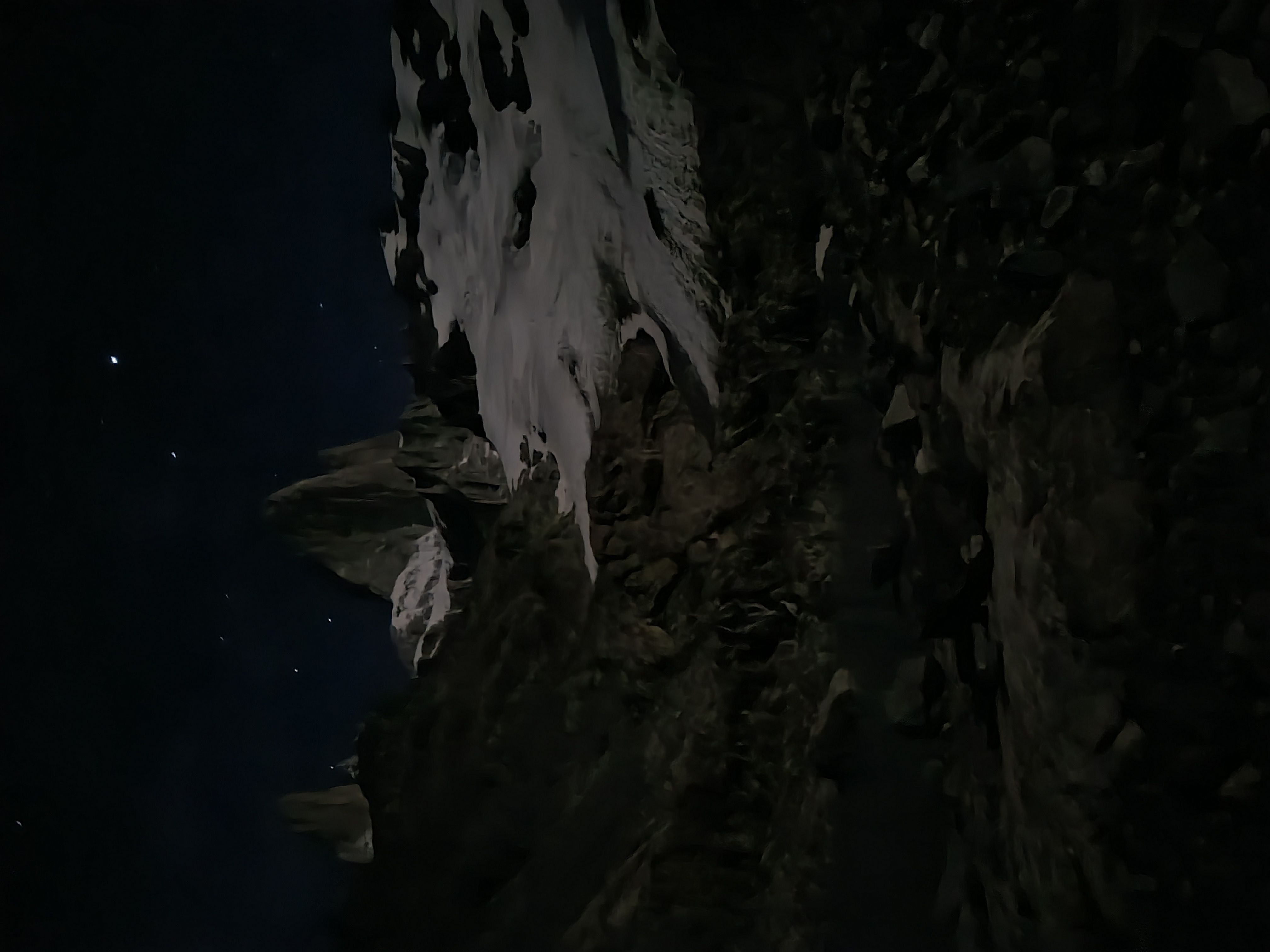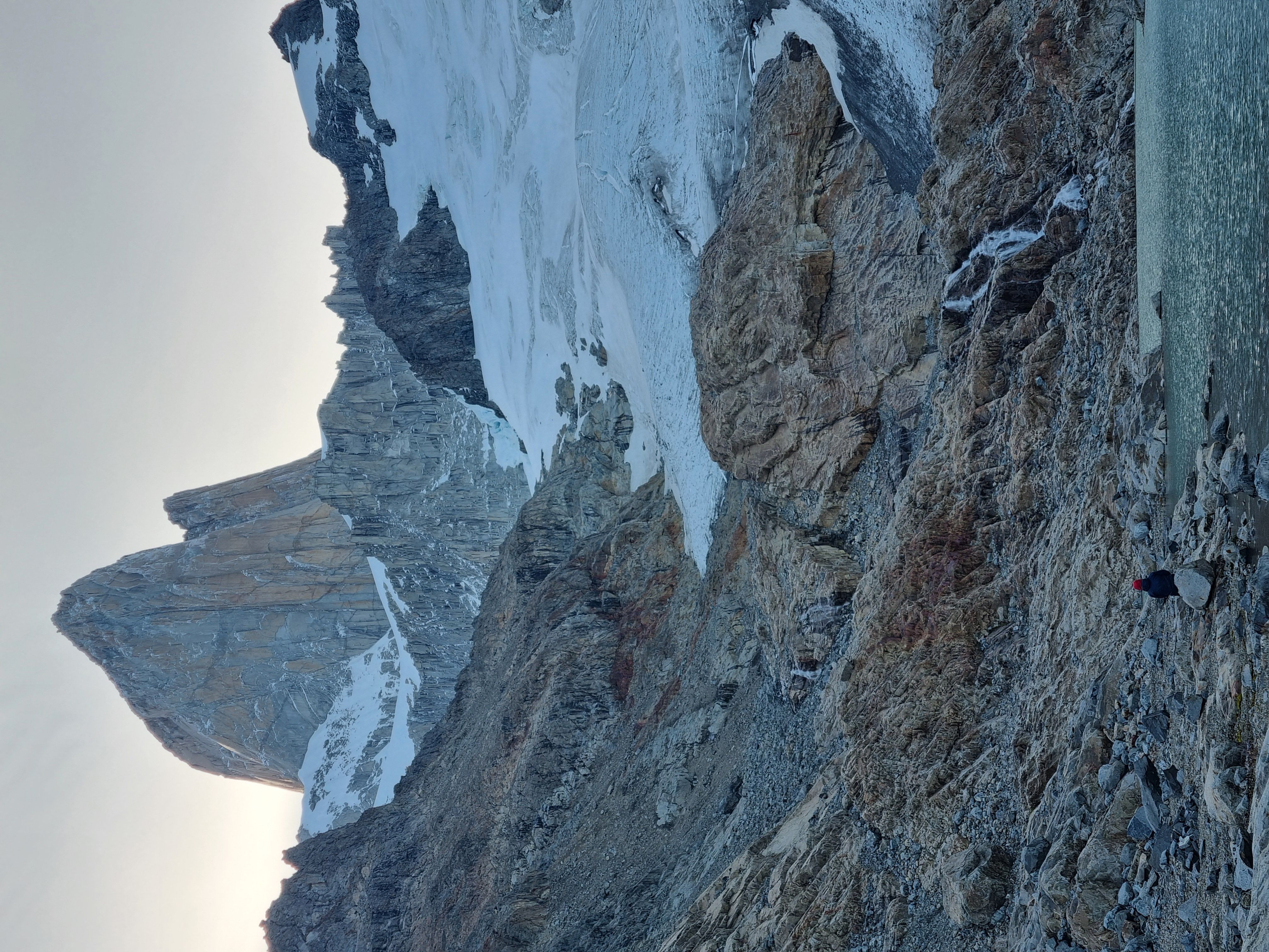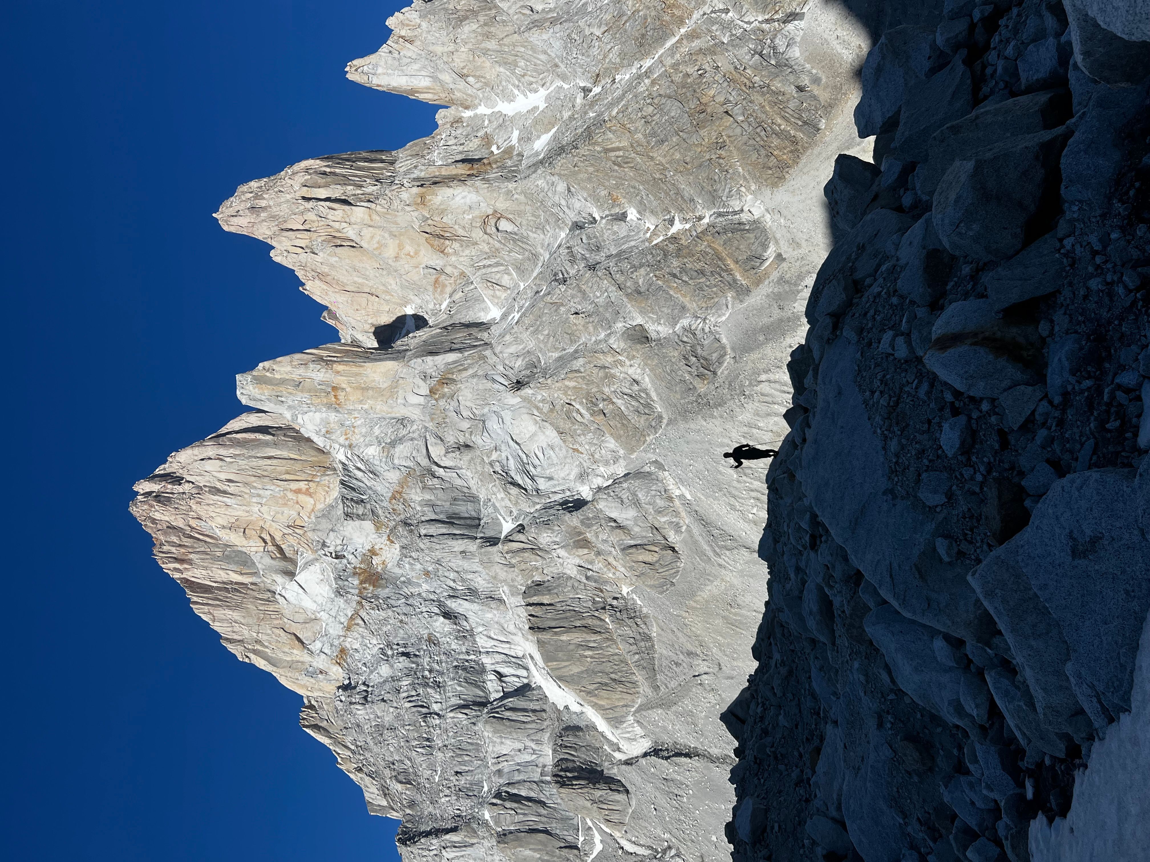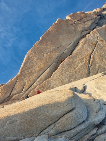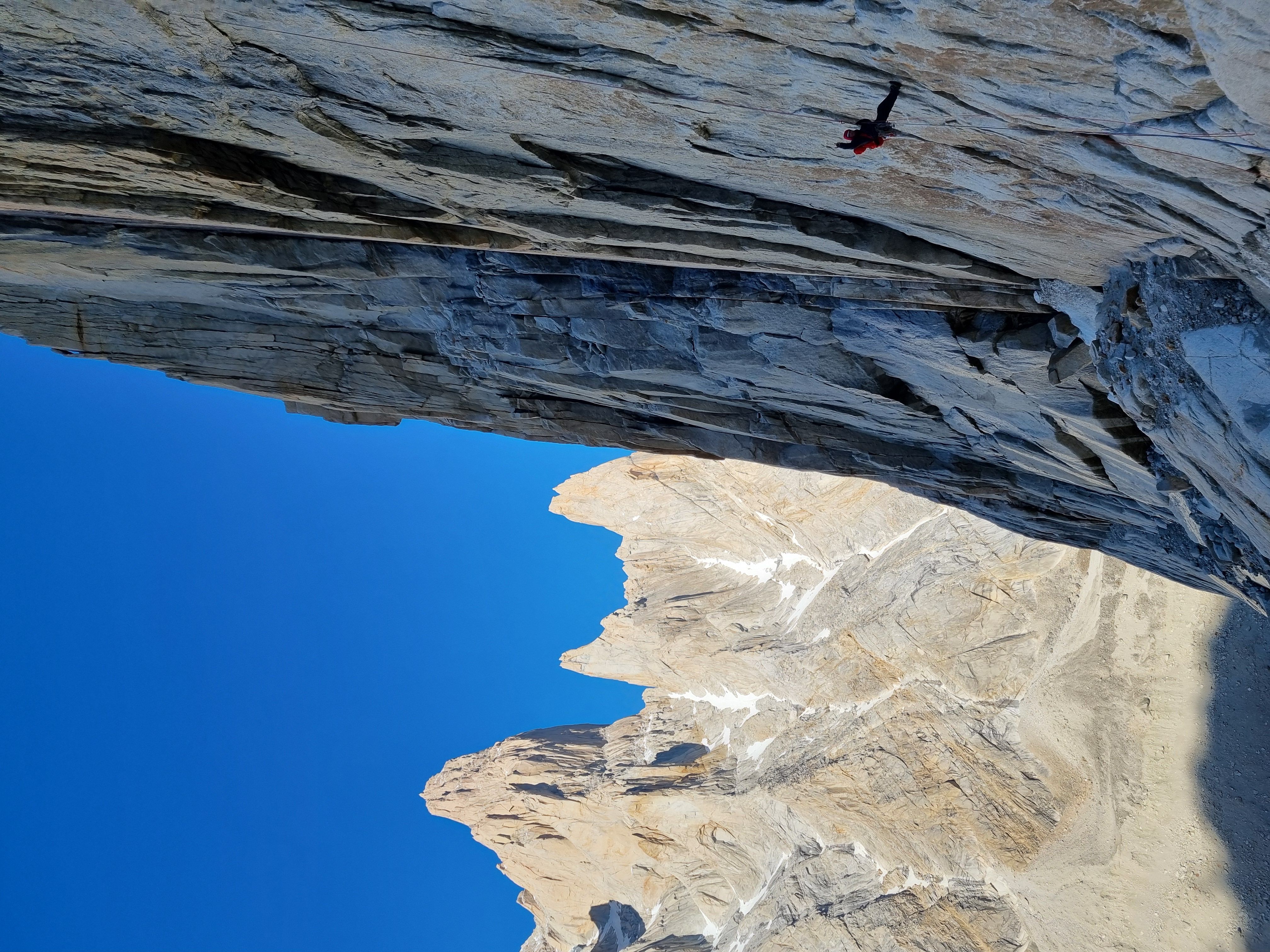 Morgengry pÄ Niponino er noe av det mest spektakulÊre jeg har opplevd. Fritt for dyre- og planteliv er dette golde landskapet ÞredÞvende stille mens jeg finner frem Jetboilen for Ä koke vann til kaffe og frokost. Kl 08 forlater vi camp, klarer Ä rote oss av stien og istedet blir nÞdt til Ä smÞre opp svaene i anmarsjsko. Ved innsteget ser vi et taulag pÄ 3 hÞyt oppe i veggen, men de er langt nok foran oss til at vi ikke tror det blir et problem. Vi racker opp og stasher sko pÄ bÄnn.