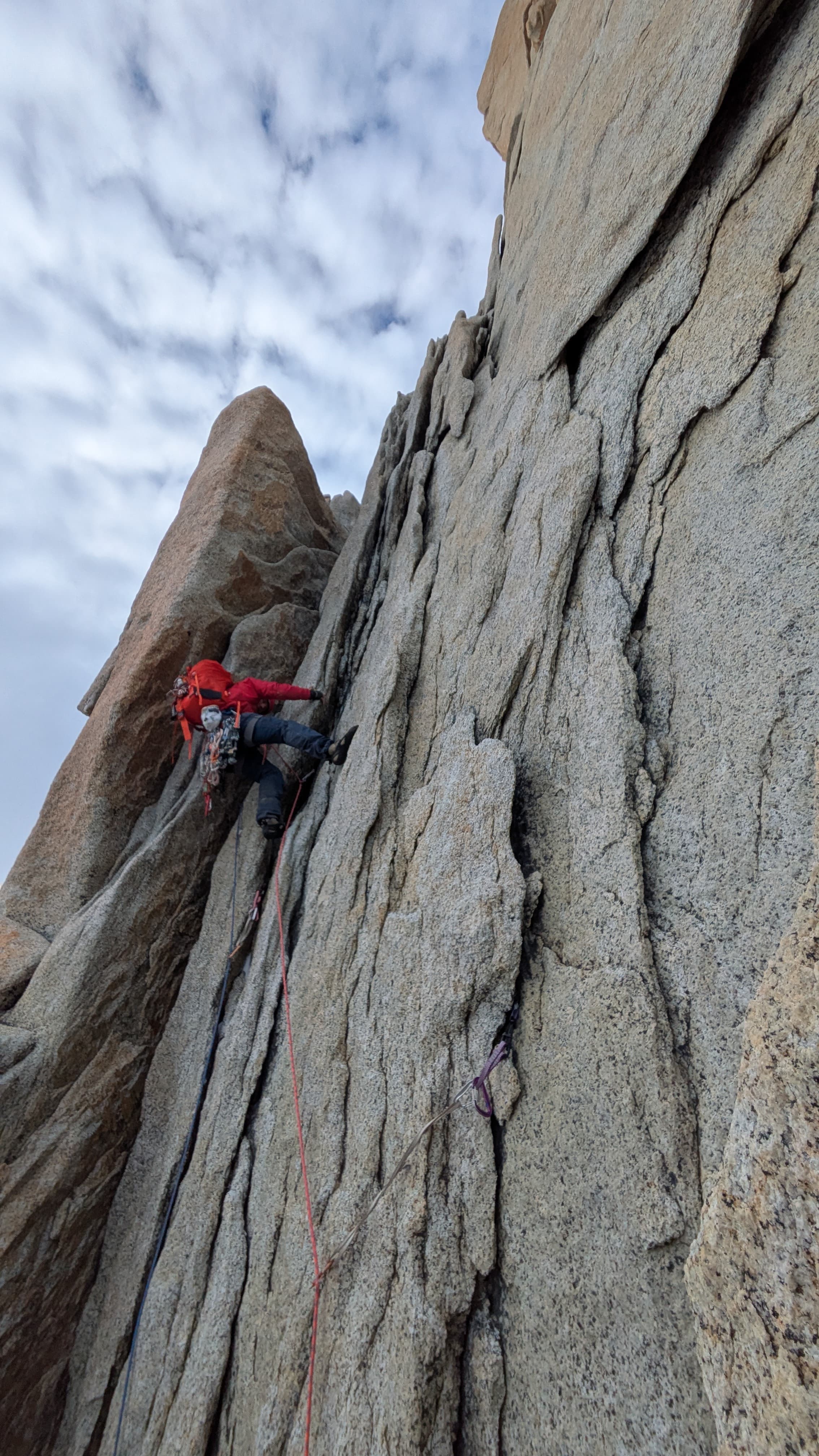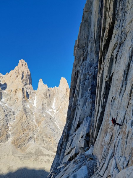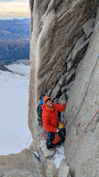 Sondre er skikkelig i slaget - muligvis er det skyggen av Cerro Torre som gir ham ekstra styrke - han flyr opp de fĂžrste 3 taulengdene lĂžpende, og jeg puster det slovenske taulaget i nakken pĂ„ vei opp til cruxet. Jeg er litt sliten etter den lange innmarsjen, sĂ„ jeg er glad nĂ„r Sondre melder seg til Ă„ lede. PĂ„ strak arm kjemper han seg igjennom et overhengende hjĂžrne med muligens den beste utsikten vi noensinne har klatret i. Etter det hĂžrer jeg noen anstrengte lyder mens Sondre kjemper seg videre opp sprekken, fĂžr endelig - “Standplass!”. NĂ„ er det ingen vei tilbake - den trĂžtte kroppen skal opp veggen. Jeg forbereder meg mentalt pĂ„ Ă„ kunne falle, men idet jeg begynner pĂ„ taket kommer endelig flyten tilbake. Jeg karrer meg opp til stand og uttrykker min ĂŠrefrykt til Sondre, som kvitterer: “Helt ĂŠrlig trodde jeg det ville bli et heng i tauet - men sĂ„ titta Cerro Torre frem bak skyene, og da var det som om pumpen forsvant fra armene.” Her mĂ„ jeg gi Sondre rett - det er altsĂ„ useriĂžst flott.