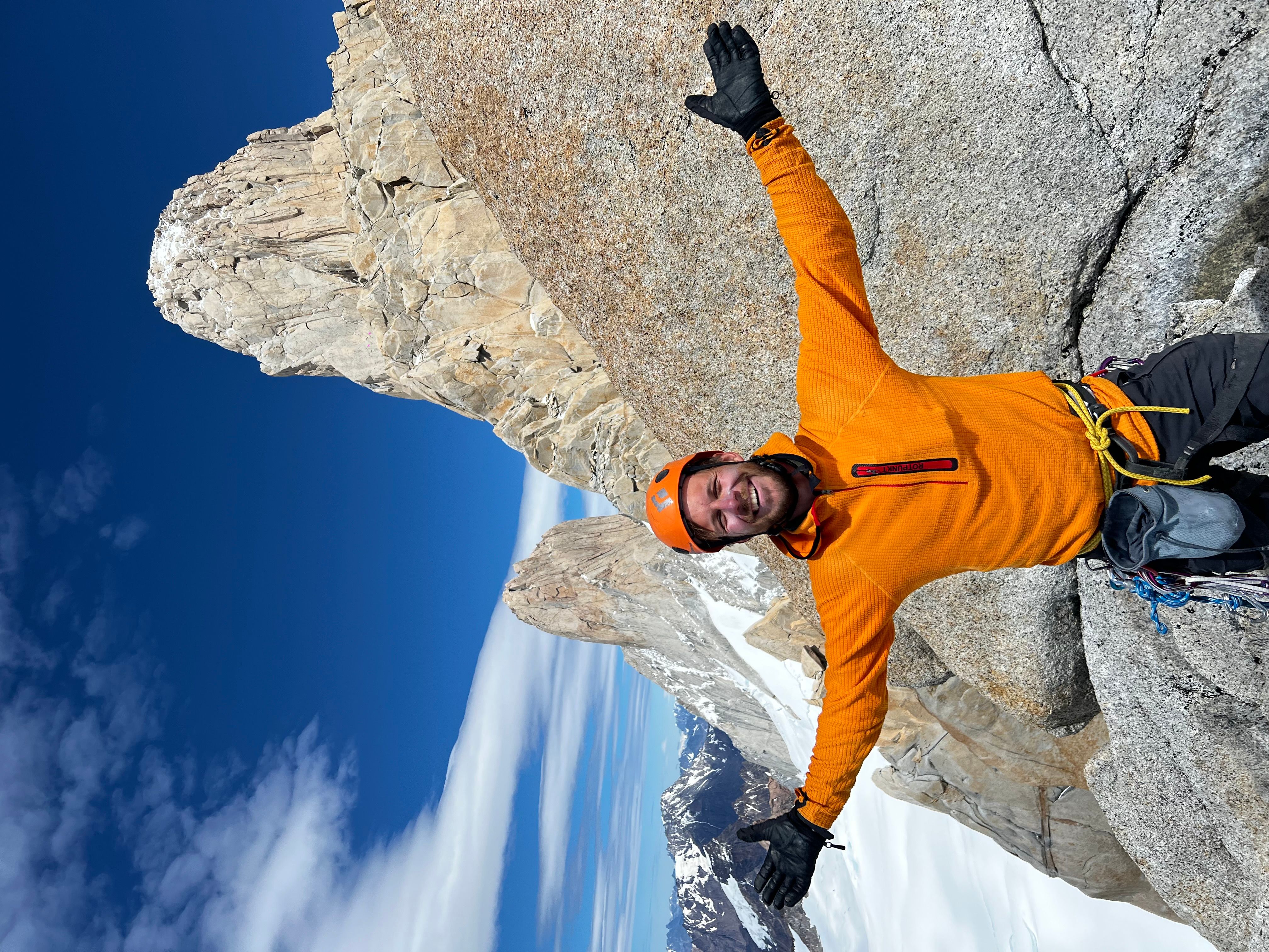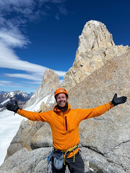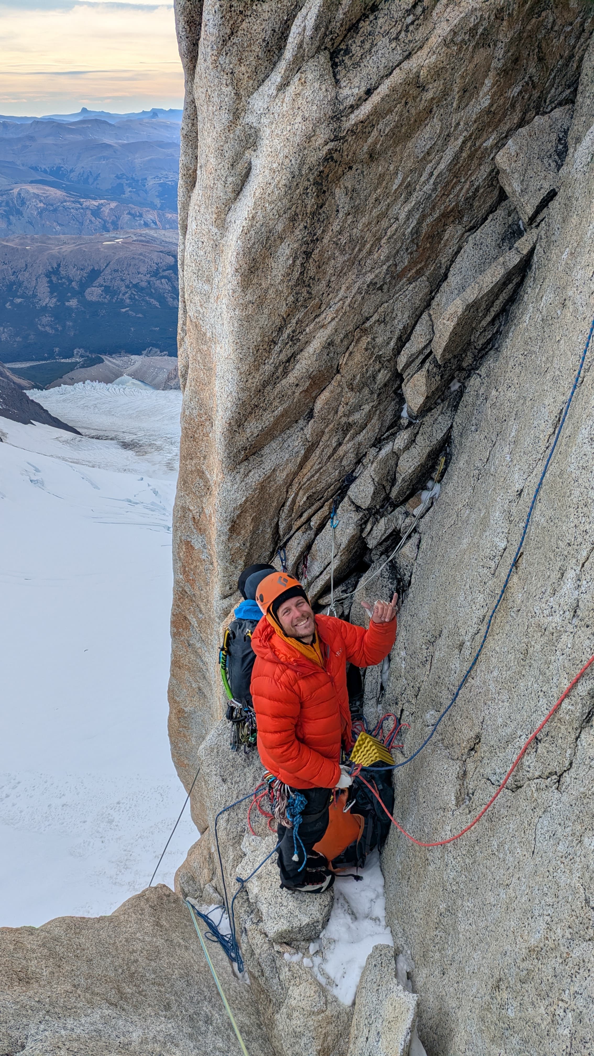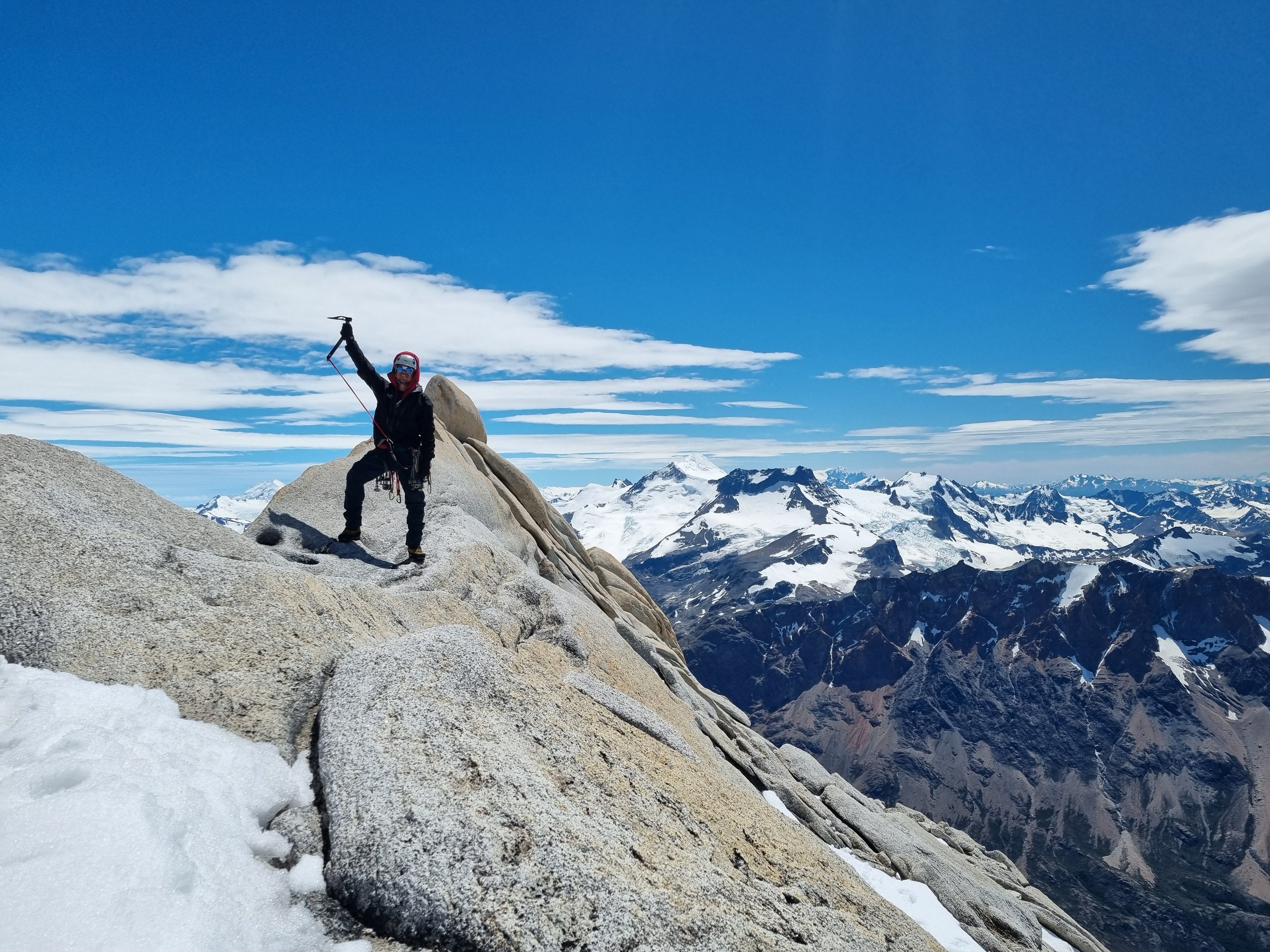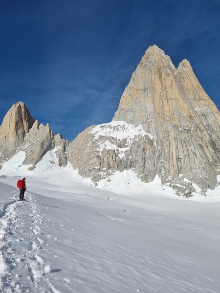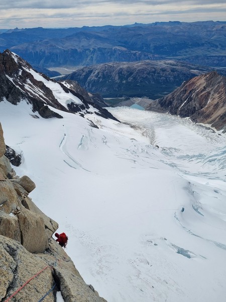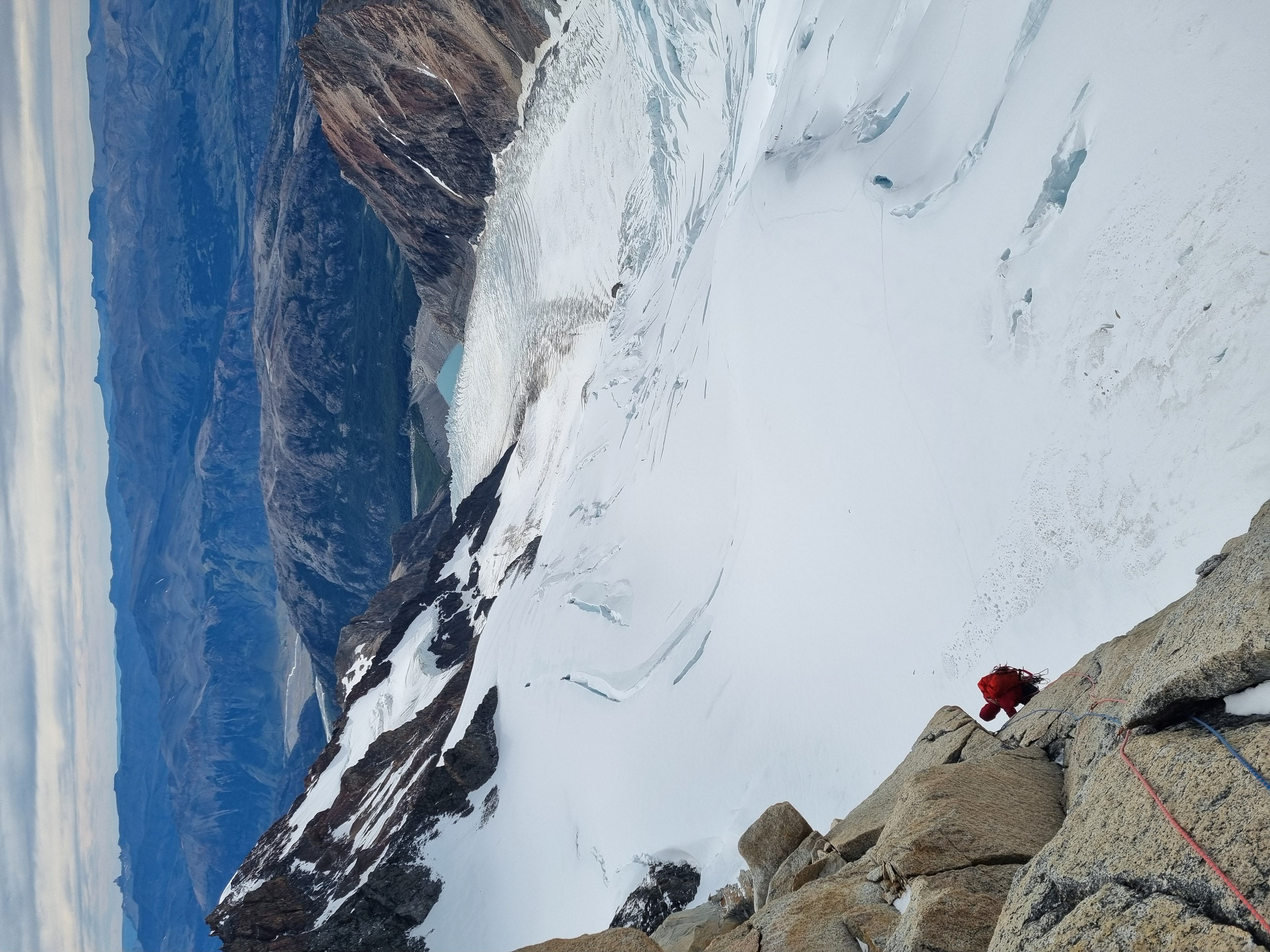 NyttÄrsmorgenen starter med Ä gni sÞvnen ut av Þynene i mÞrket. Hodelykta mi er tom for jus, sÄ jeg blir nÞdt til Ä bruke telefonen under buffen pÄ vei opp mot breen. Heldigvis lysner det fort, og nÄr vi trÄr ut pÄ breen er det allerede dagslys. VÄre australske venner hadde ingen erfaring pÄ bre, og spurte om vi kunne ta de med over breen, sÄ vi gÄr 5 stykker i taulaget. Cirka 500m inn pÄ breen kjenner jeg plutselig et sug i magen, og fÞr jeg vet hva som skjer henger jeg i selen. Omtrent 6 timer inn i det nye Äret har jeg gÄtt i min fÞrste bresprekk - heldigvis er tauet stramt og jeg klyver opp uten stÞrre vanskeligheter. Vel fremme ved innsteget stasher vi stegjern, stÞvler, og Þks, og jeg sender Sondre opp pÄ fÞrste led. Vi simulklatrer opp til snÞfeltet i 2 pitches, og klyver rundt snÞen og opp pÄ ryggen. Sondre er gavmild og lar meg fÄ toppstÞtet - en 6a+ pitch og den mest eksponerte taulengden hittil. FÞlelsen av Ä klatre i disse omgivelsene, men Cerro Chalten pÄ hÞyre hÄnd, og Cerro Torre til venstre, kan vanskelig beskrives med ord - og euforien gÄr opp i en hÞyere enhet idet Sondre nÄr toppen.