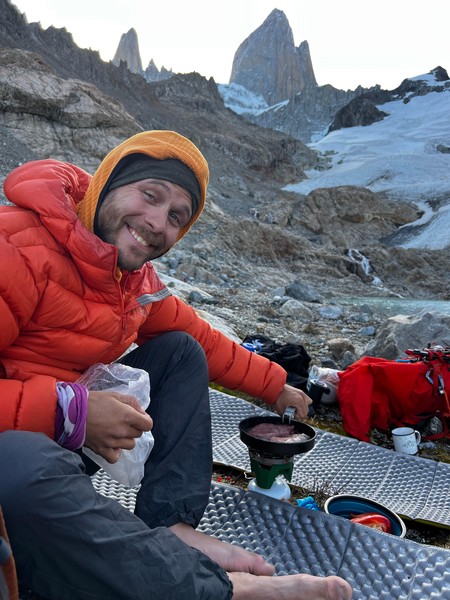 Det er Sondres bursdag, og kvelden fÞr har vi gÄtt opp Fitz Roy-stien til Laguna De Los Tres og fortsatt litt lengre til vi kom til campen under breen. Siden det var fullt hus oppe pÄ Paso Superior, la vi oss godt til rette med utsikt opp mot Cerro Chalten der den ruver som en gigantisk pipe over et nedsnÞdd setertak.
